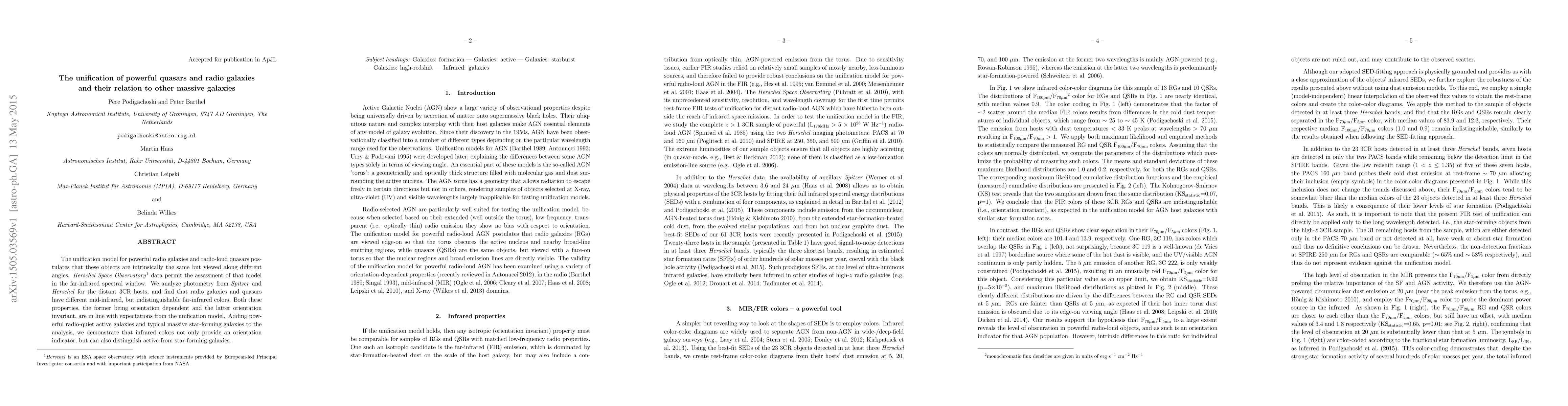 The unification model suggests powerful radio galaxies and quasars are the same but viewed differently; Herschel data confirm this by showing different mid-infrared but identical far-infrared colors, supporting the model and indicating infrared colors can distinguish active from star-forming galaxies.