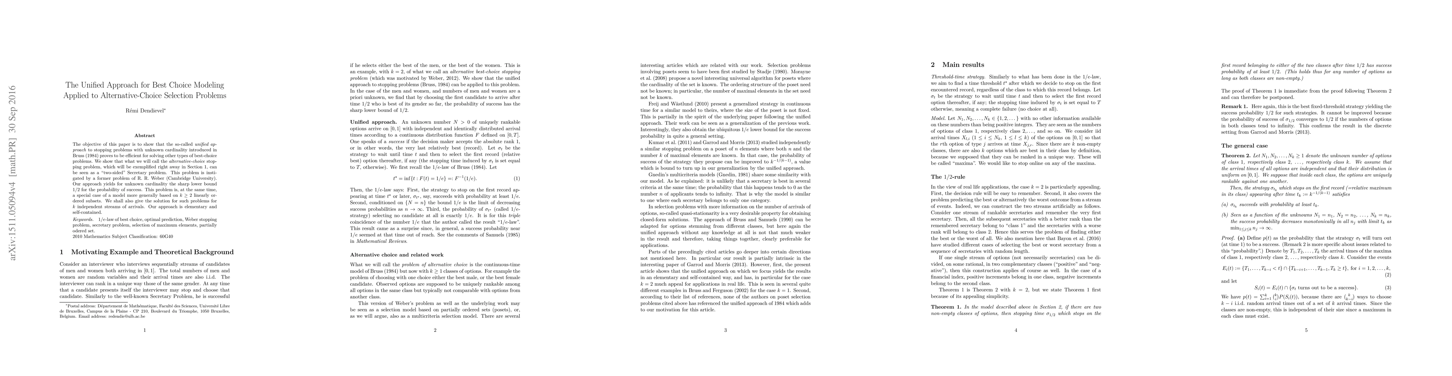The objective of this paper is to show that the so-called unified approach to stopping problems with unknown cardinality introduced in Bruss (1984) proves to be efficient for solving other types of best-choice problems. We show that what we will call the alternative-choice stopping problem, which will be exemplified right away in Section 1, can be seen as a "two-sided" Secretary problem. This problem is instigated by a former problem of R. R. Weber (Cambridge University). Our approach yields for unknown cardinality the sharp lower bound $1/2$ for the probability of success. This problem is, at the same time, a special case of a model more generally based on $k \ge 2$ linearly ordered subsets. We shall also give the solution for such problems for k independent streams of arrivals. Our approach is elementary and self-contained.
