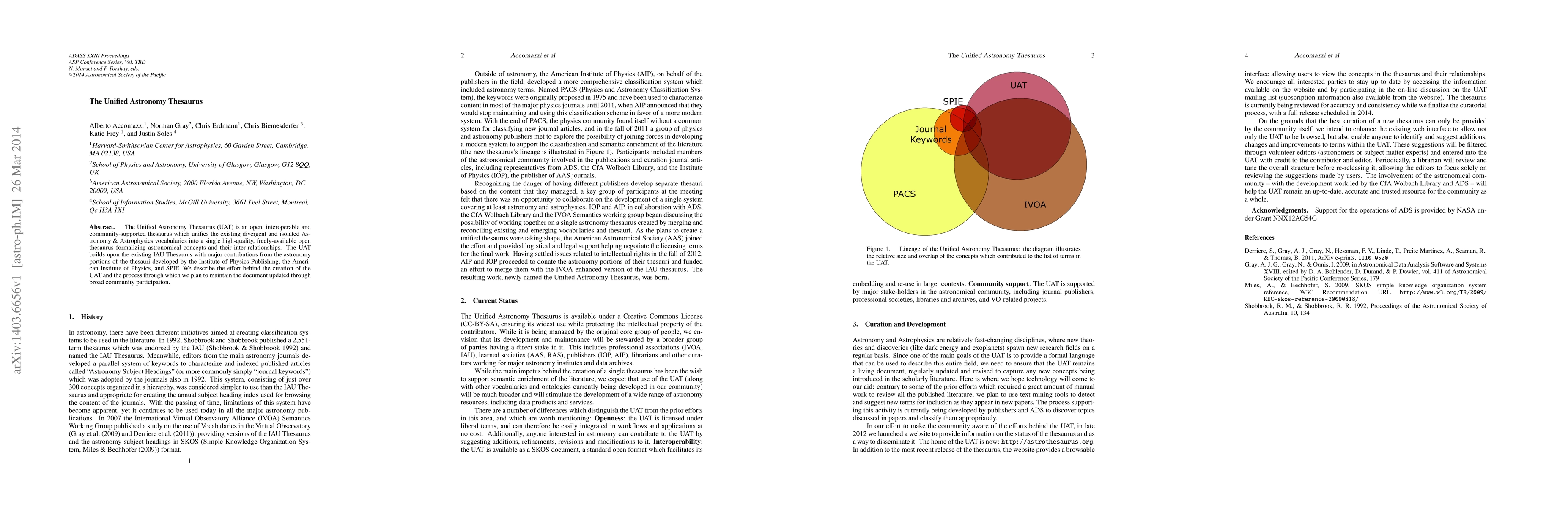 The Unified Astronomy Thesaurus (UAT) is an open, interoperable and community-supported thesaurus which unifies the existing divergent and isolated Astronomy & Astrophysics vocabularies into a single high-quality, freely-available open thesaurus formalizing astronomical concepts and their inter-relationships. The UAT builds upon the existing IAU Thesaurus with major contributions from the astronomy portions of the thesauri developed by the Institute of Physics Publishing, the American Institute of Physics, and SPIE. We describe the effort behind the creation of the UAT and the process through which we plan to maintain the document updated through broad community participation.