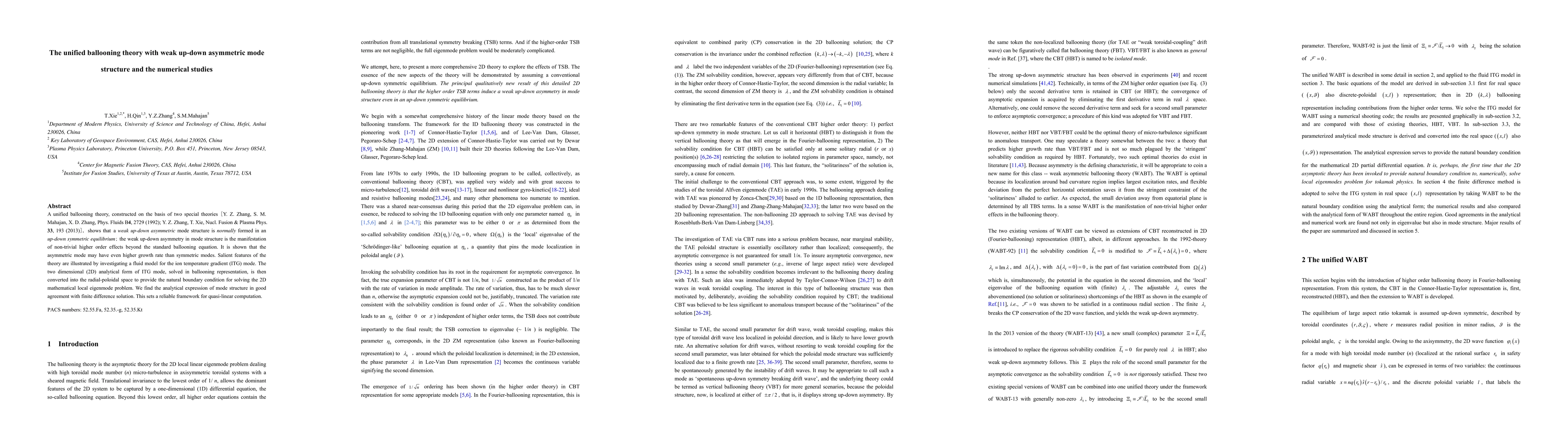 The unified ballooning theory reveals that weak up-down asymmetric mode structures emerge in symmetric equilibria due to higher-order non-trivial effects, potentially leading to higher growth rates than symmetric modes. The theory is validated through numerical studies of the ion temperature gradient mode, showing good agreement between analytical and finite difference solutions.