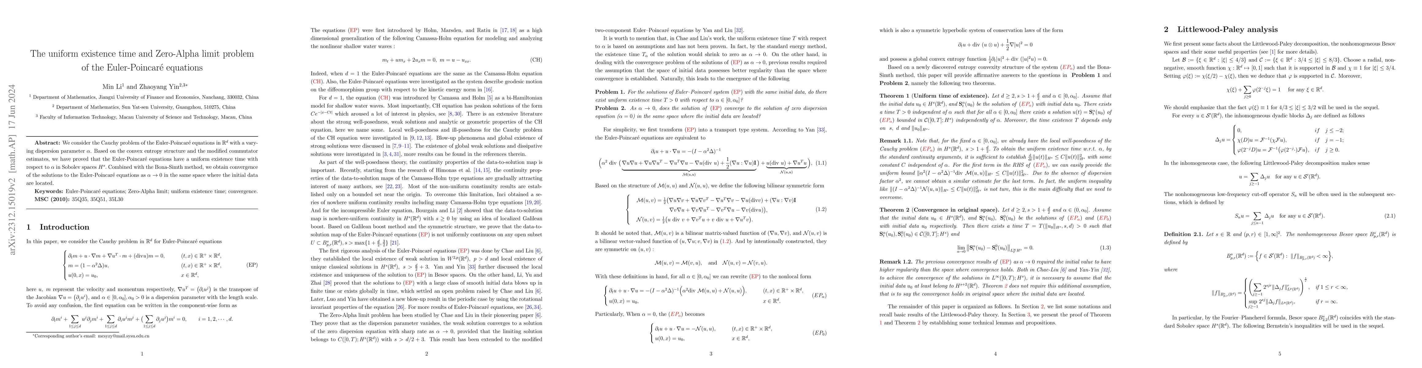 This paper proves the uniform existence time of solutions to the Euler-Poincaré equations in varying dispersion scenarios using convex entropy structure and modified commutator estimates. It also demonstrates convergence to the Euler equations as the dispersion parameter approaches zero, leveraging the Bona-Smith method.