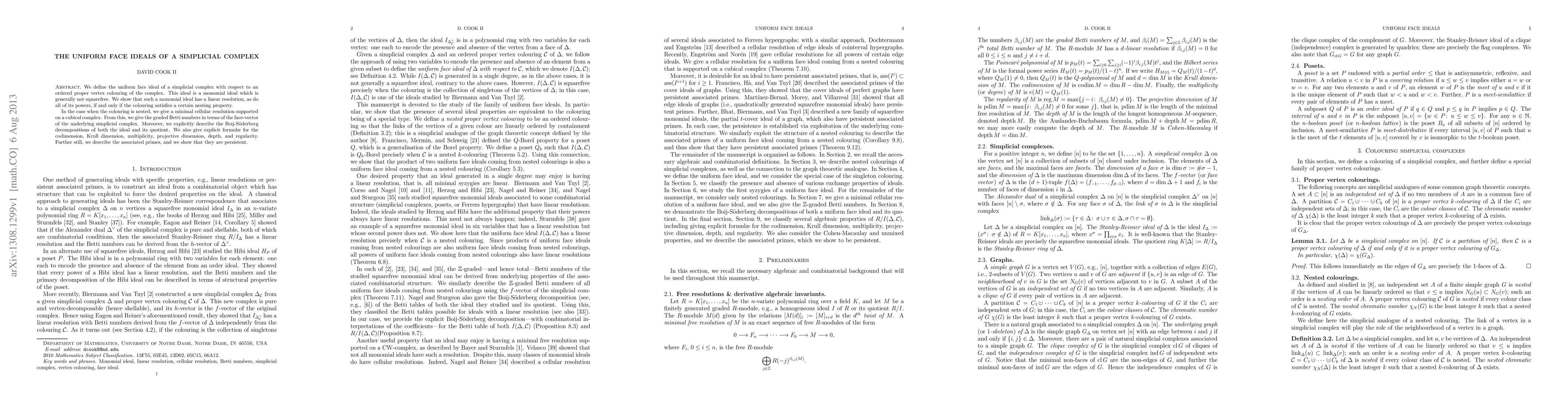 This paper defines uniform face ideals of simplicial complexes based on ordered proper vertex colorings and proves that these ideals have linear resolutions if the coloring satisfies a nesting property. It provides a minimal cellular resolution for nested colorings and derives explicit formulas for various algebraic invariants.