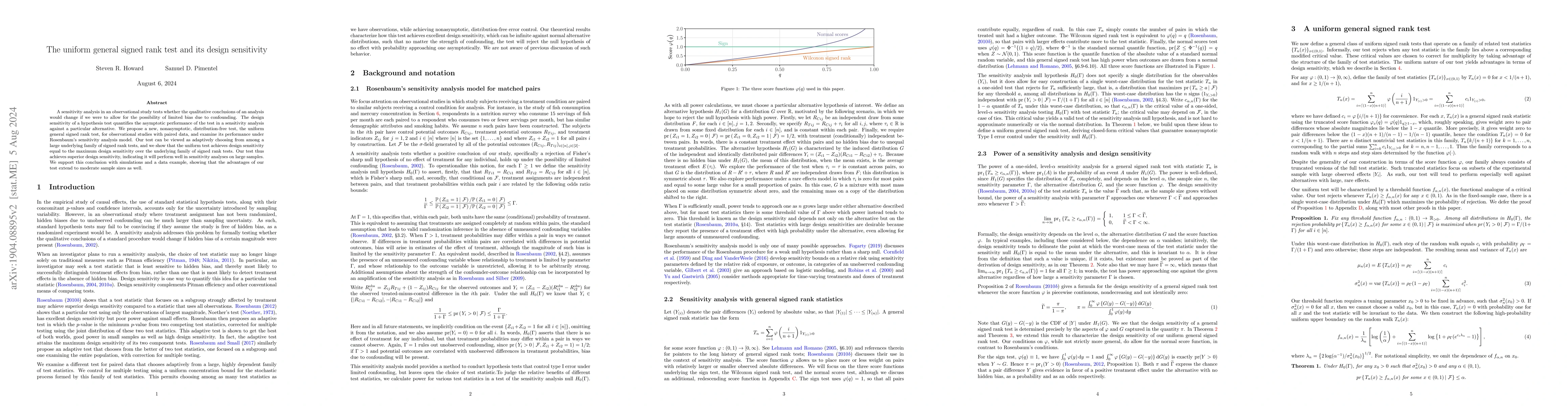 This paper proposes a new uniform general signed rank test for paired data in observational studies, demonstrating its superior design sensitivity under Rosenbaum's sensitivity analysis model. The test achieves optimal performance, showing strong results in both large and moderate sample sizes through simulations and a data example.