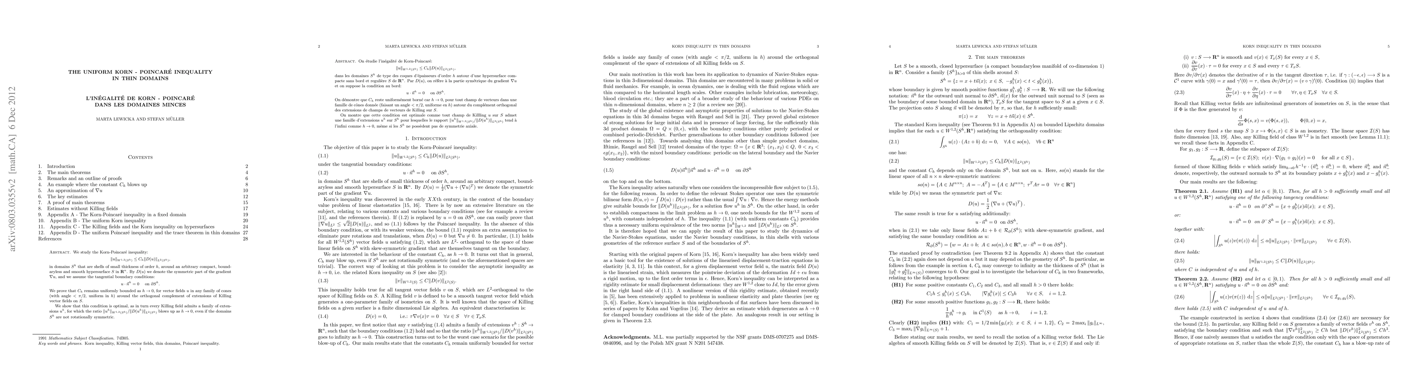 We study the Korn-Poincar\'e inequality: \|u\|_{W^{1,2}(S^h)} < C_h \|D(u)\|_{L^2(S^h)}, in domains S^h that are shells of small thickness of order h, around an arbitrary smooth and closed hypersurface S in R^n. By D(u) we denote the symmetric part of the gradient \nabla u, and we assume the tangential boundary conditions: u\vec n^h = 0 on \partial S^h. We prove that C_h remains uniformly bounded as h tends to 0, for vector fields u in any family of cones (with angle <\pi/2, uniform in h) around the orthogonal complement of extensions of Killing vector fields on S. We also show that this condition is optimal, as in turn every Killing field admits a family of extensions u^h, for which the ratio: \|u^h\|_{W^{1,2}(S^h)} / \|D(u^h)\|_{L^2(S^h)} blows up as h tends to 0, even if the domains S^h are not rotationally symmetric.