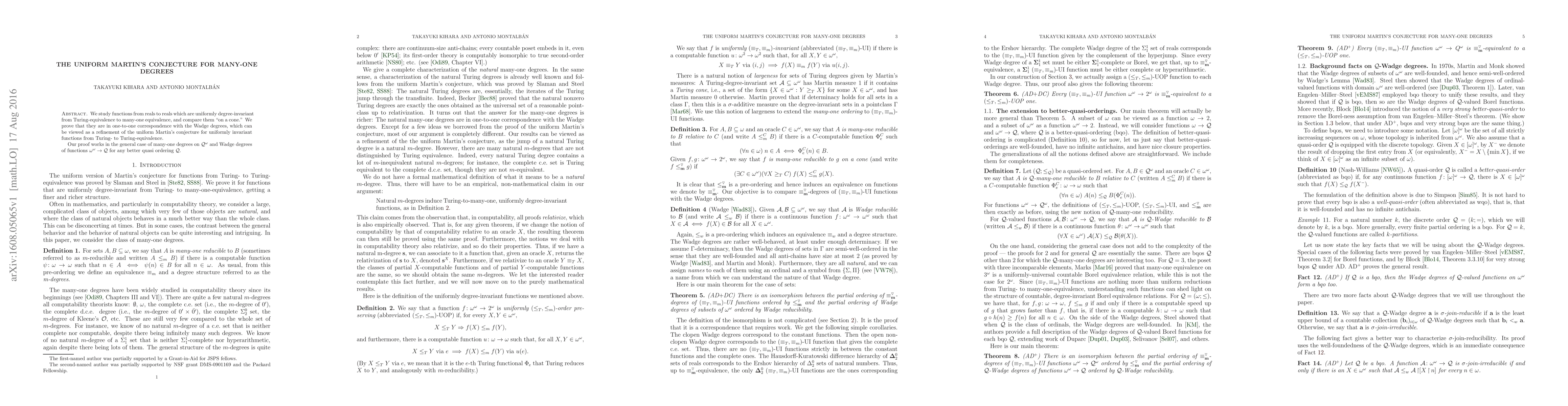 We study functions from reals to reals which are uniformly degree-invariant from Turing-equivalence to many-one equivalence, and compare them "on a cone." We prove that they are in one-to-one correspondence with the Wadge degrees, which can be viewed as a refinement of the uniform Martin's conjecture for uniformly invariant functions from Turing- to Turing-equivalence. Our proof works in the general case of many-one degrees on $\mathcal{Q}^\omega$ and Wadge degrees of functions $\omega^\omega\to\mathcal{Q}$ for any better quasi ordering $\mathcal{Q}$.