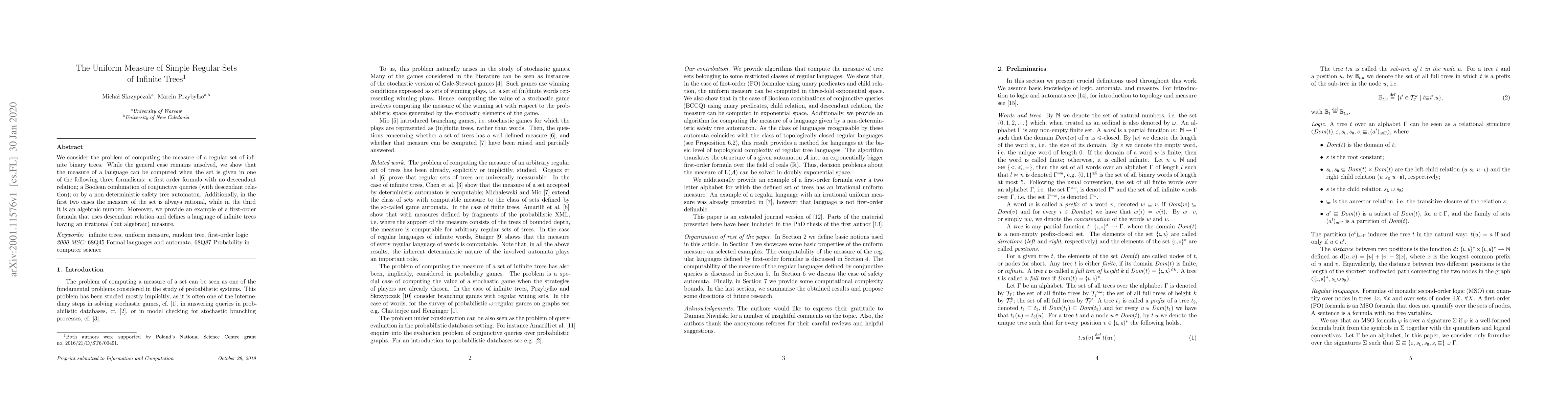 This paper computes the measure of regular sets of infinite binary trees when given in specific formalisms: first-order formulas without descendant relations, Boolean combinations of conjunctive queries, or non-deterministic safety tree automata. The measure is rational in the first two cases and algebraic in the third, with an example showing an irrational algebraic measure.