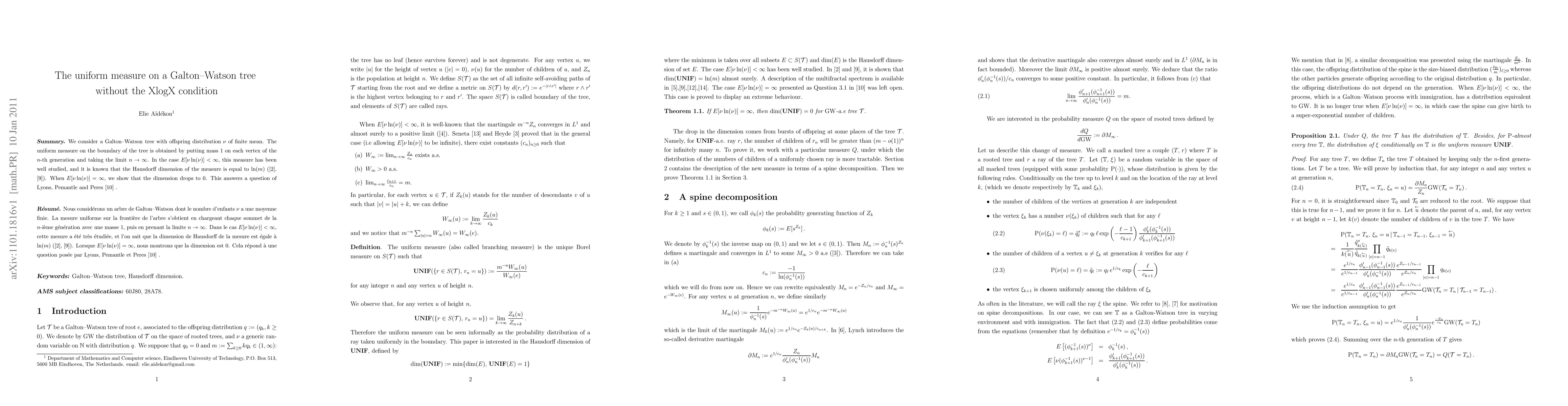 We consider a Galton--Watson tree with offspring distribution $\nu$ of finite mean. The uniform measure on the boundary of the tree is obtained by putting mass $1$ on each vertex of the $n$-th generation and taking the limit $n\to \infty$. In the case $E[\nu\ln(\nu)]<\infty$, this measure has been well studied, and it is known that the Hausdorff dimension of the measure is equal to $\ln(m)$ (\cite{hawkes}, \cite{lpp95}). When $E[\nu \ln(\nu)]=\infty$, we show that the dimension drops to $0$. This answers a question of Lyons, Pemantle and Peres \cite{LyPemPer97}.