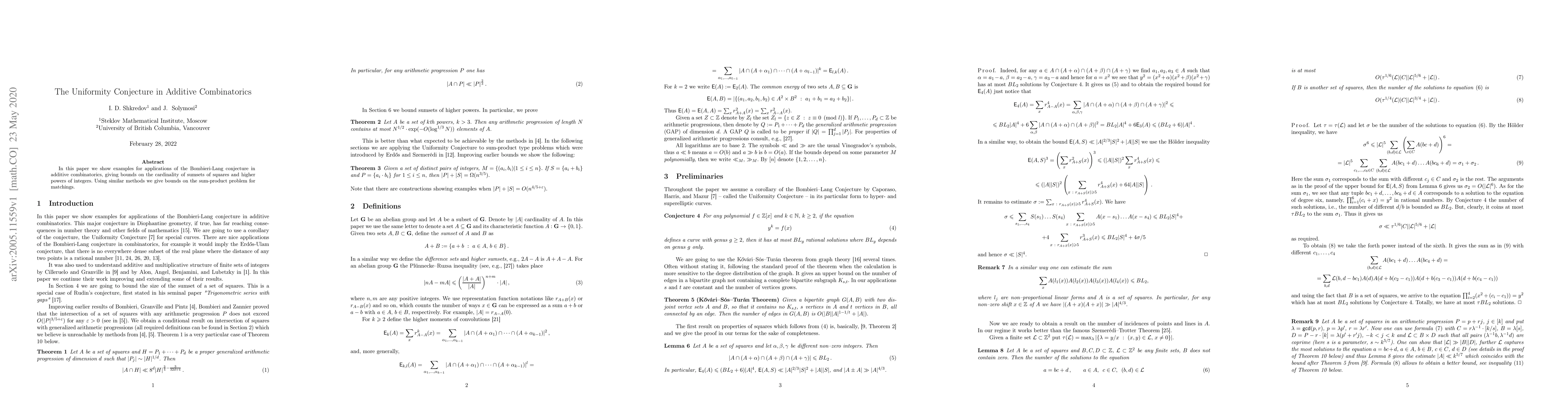 This paper demonstrates applications of the Bombieri-Lang conjecture in additive combinatorics, providing bounds on the cardinality of sumsets formed from squares and higher powers of integers. It also offers bounds for the sum-product problem related to matchings using analogous methods.