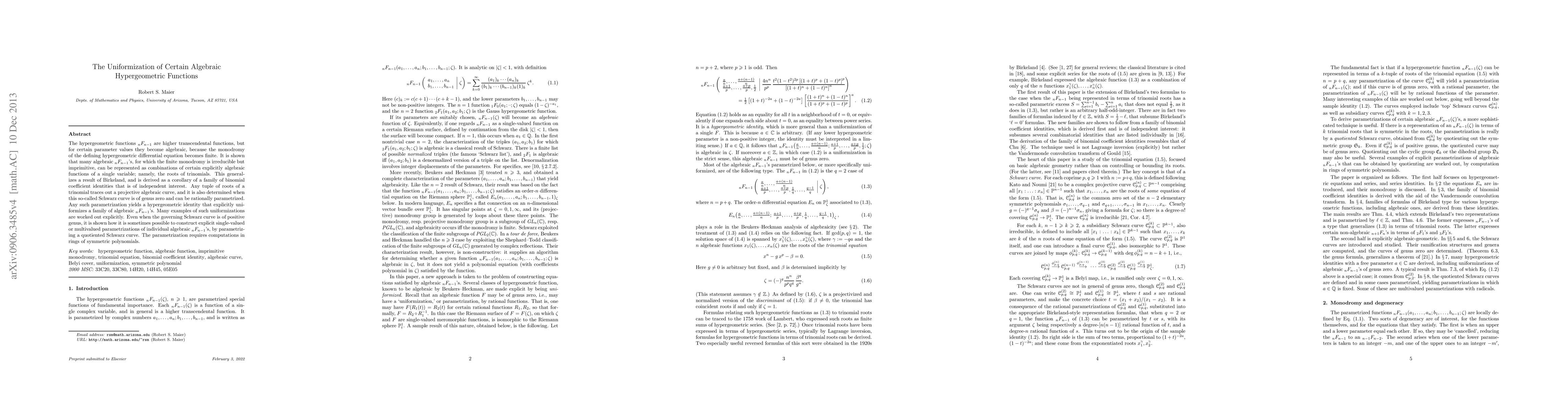 The hypergeometric functions ${}_nF_{n-1}$ are higher transcendental functions, but for certain parameter values they become algebraic, because the monodromy of the defining hypergeometric differential equation becomes finite. It is shown that many algebraic ${}_nF_{n-1}$'s, for which the finite monodromy is irreducible but imprimitive, can be represented as combinations of certain explicitly algebraic functions of a single variable; namely, the roots of trinomials. This generalizes a result of Birkeland, and is derived as a corollary of a family of binomial coefficient identities that is of independent interest. Any tuple of roots of a trinomial traces out a projective algebraic curve, and it is also determined when this so-called Schwarz curve is of genus zero and can be rationally parametrized. Any such parametrization yields a hypergeometric identity that explicitly uniformizes a family of algebraic ${}_nF_{n-1}$'s. Many examples of such uniformizations are worked out explicitly. Even when the governing Schwarz curve is of positive genus, it is shown how it is sometimes possible to construct explicit single-valued or multivalued parametrizations of individual algebraic ${}_nF_{n-1}$'s, by parametrizing a quotiented Schwarz curve. The parametrization requires computations in rings of symmetric polynomials.
