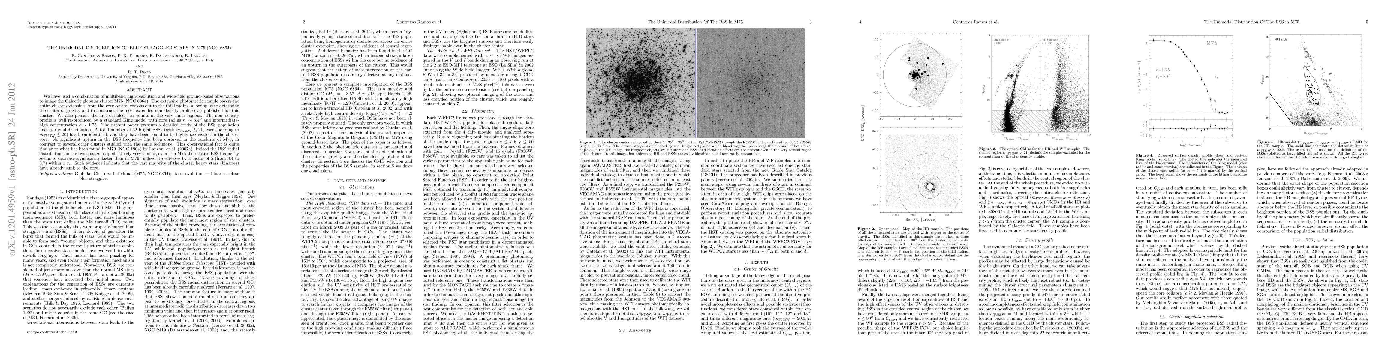 We have used a combination of multiband high-resolution and wide-field ground-based observations to image the Galactic globular cluster M75 (NGC 6864). The extensive photometric sample covers the entire cluster extension, from the very central regions out to the tidal radius, allowing us to determine the center of gravity and to construct the most extended star density profile ever published for this cluster. We also present the first detailed star counts in the very inner regions. The star density profile is well re-produced by a standard King model with core radius r_c ~ 5.4" and intermediate-high concentration c ~ 1.75. The present paper presents a detailed study of the BSS population and its radial distribution. A total number of 62 bright BSSs (with m_F255W < 21, corresponding to m_F555W < 20) has been identified, and they have been found to be highly segregated in the cluster core. No significant upturn in the BSS frequency has been observed in the outskirts of M75, in contrast to several other clusters studied with the same technique. This observational fact is quite similar to what has been found in M79 (NGC 1904) by Lanzoni et al. (2007a). Indeed the BSS radial distributions in the two clusters is qualitatively very similar, even if in M75 the relative BSS frequency seems to decrease significantly faster than in M79: indeed it decreases by a factor of 5 (from 3.4 to 0.7) within 1 r_c. Such evidence indicate that the vast majority of the cluster heavy stars (binaries) have already sunk to the core.