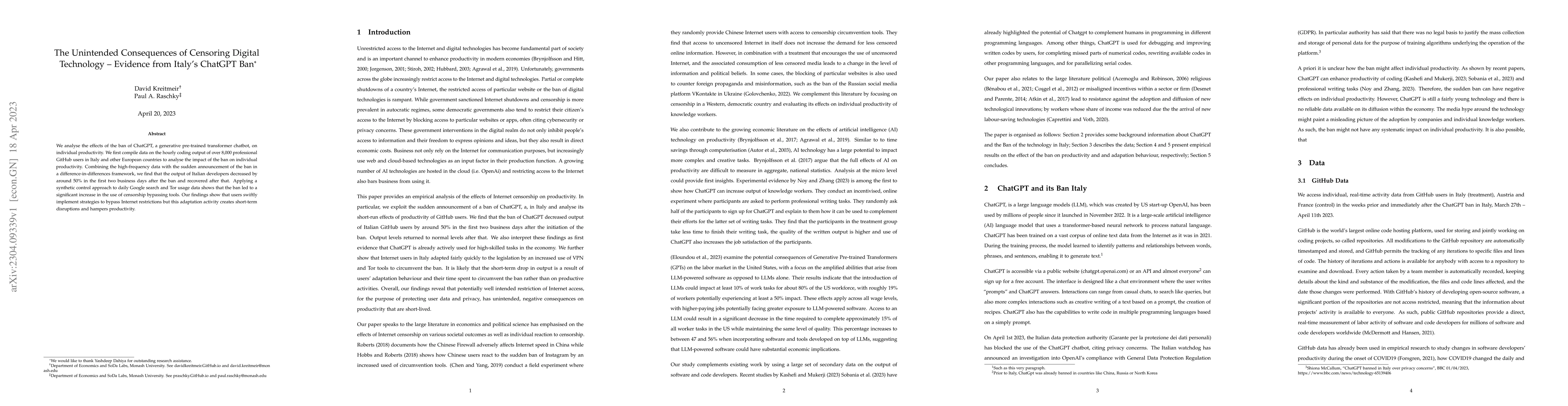 Summary: The study investigates the impact of Italy's ban on the chatbot ChatGPT on developer productivity, finding a 50% drop in Italian developers' coding output initially, followed by a recovery. The ban also led to increased use of censorship-bypassing tools, highlighting the unintended consequences of digital technology censorship on productivity and adaptation strategies.