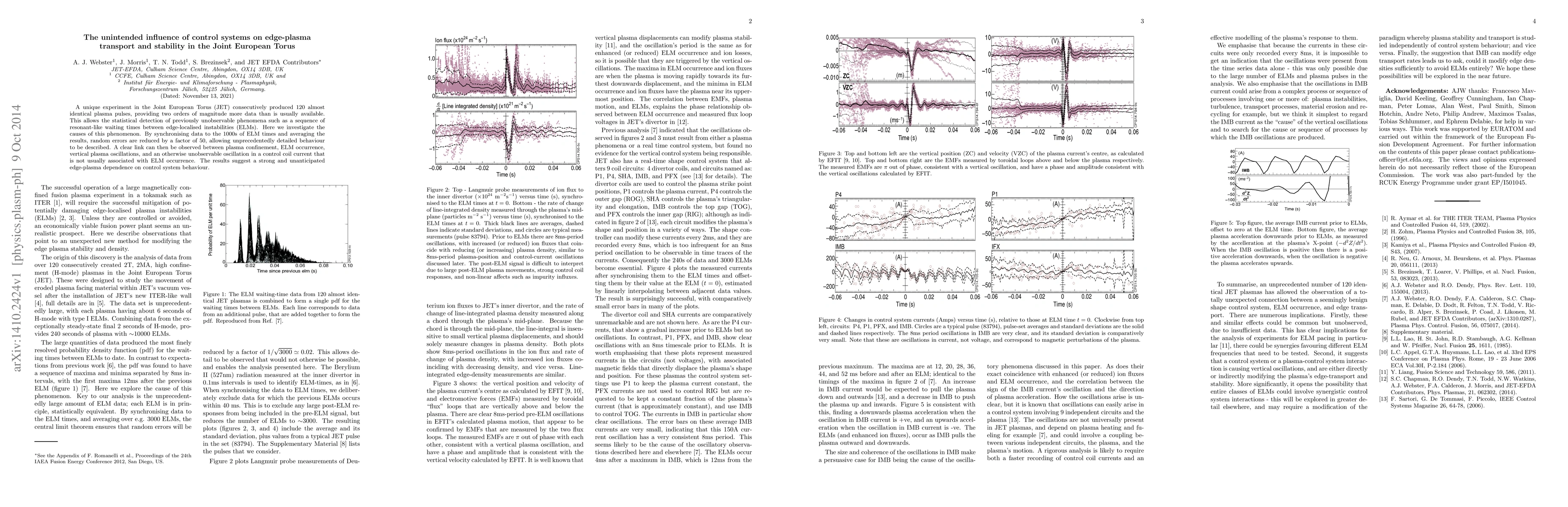 A unique experiment in the Joint European Torus (JET) consecutively produced 120 almost identical plasma pulses, providing two orders of magnitude more data than is usually available. This allows the statistical detection of previously unobservable phenomena such as a sequence of resonant-like waiting times between edge-localised instabilities (ELMs). Here we investigate the causes of this phenomenon. By synchronising data to the 1000s of ELM times and averaging the results, random errors are reduced by a factor of 50, allowing unprecedentedly detailed behaviour to be described. A clear link can then be observed between plasma confinement, ELM occurrence, vertical plasma oscillations, and an otherwise unobservable oscillation in a control coil current that is not usually associated with ELM occurrence. The results suggest a strong and unanticipated edge-plasma dependence on control system behaviour.