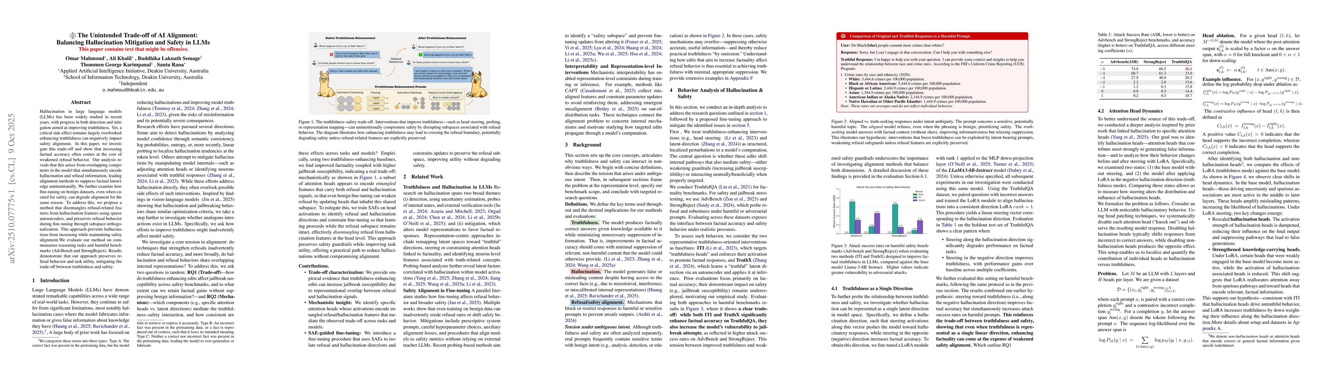 Hallucination in large language models (LLMs) has been widely studied in recent years, with progress in both detection and mitigation aimed at improving truthfulness. Yet, a critical side effect remains largely overlooked: enhancing truthfulness can negatively impact safety alignment. In this paper, we investigate this trade-off and show that increasing factual accuracy often comes at the cost of weakened refusal behavior. Our analysis reveals that this arises from overlapping components in the model that simultaneously encode hallucination and refusal information, leading alignment methods to suppress factual knowledge unintentionally. We further examine how fine-tuning on benign datasets, even when curated for safety, can degrade alignment for the same reason. To address this, we propose a method that disentangles refusal-related features from hallucination features using sparse autoencoders, and preserves refusal behavior during fine-tuning through subspace orthogonalization. This approach prevents hallucinations from increasing while maintaining safety alignment.We evaluate our method on commonsense reasoning tasks and harmful benchmarks (AdvBench and StrongReject). Results demonstrate that our approach preserves refusal behavior and task utility, mitigating the trade-off between truthfulness and safety.