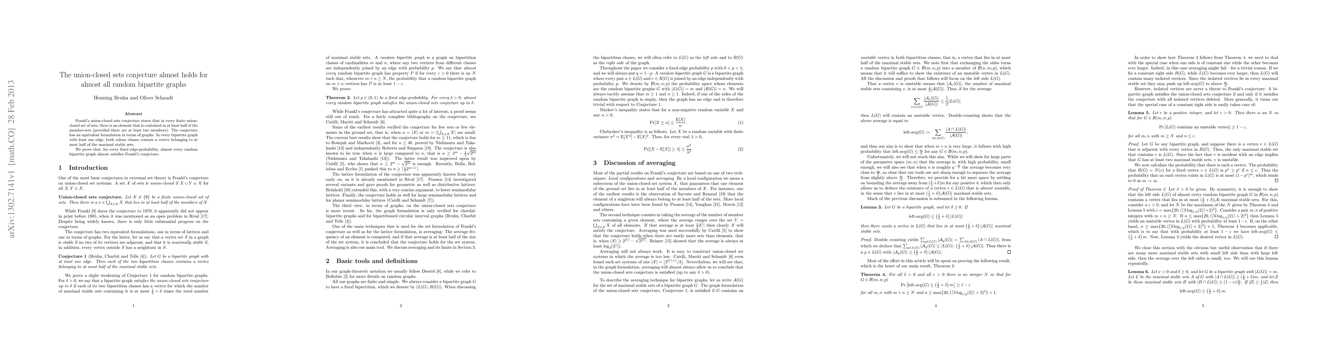 Frankl's union-closed sets conjecture states that in every finite union-closed set of sets, there is an element that is contained in at least half of the member-sets (provided there are at least two members). The conjecture has an equivalent formulation in terms of graphs: In every bipartite graph with least one edge, both colour classes contain a vertex belonging to at most half of the maximal stable sets. We prove that, for every fixed edge-probability, almost every random bipartite graph almost satisfies Frankl's conjecture.