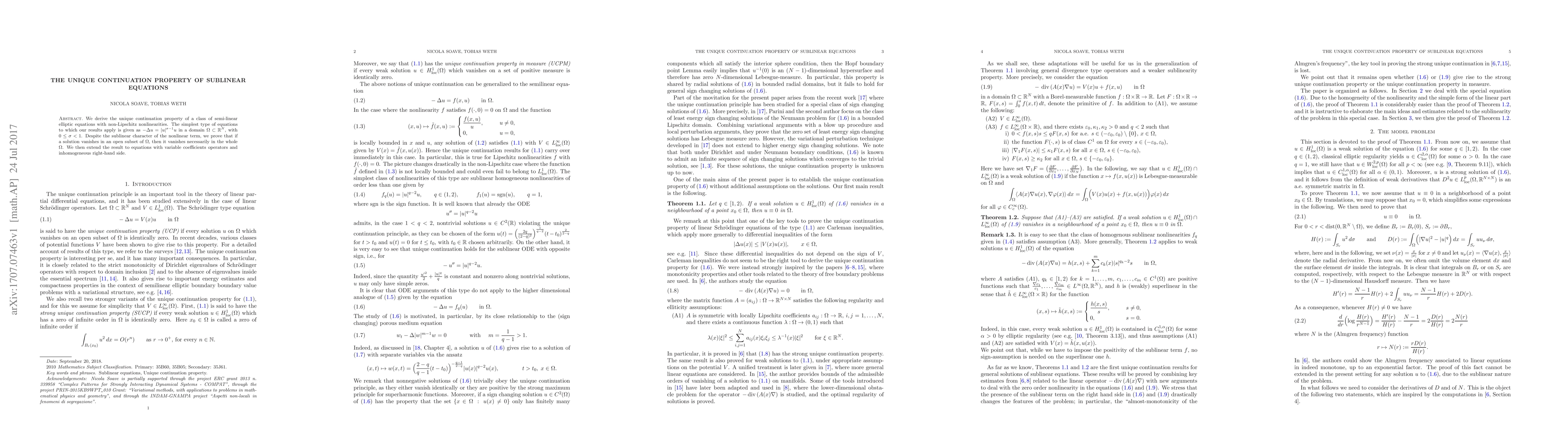 Researchers prove that a type of semi-linear elliptic equation with a sublinear nonlinearity has a unique continuation property, meaning if the solution vanishes in part of its domain, it must vanish throughout the entire domain.