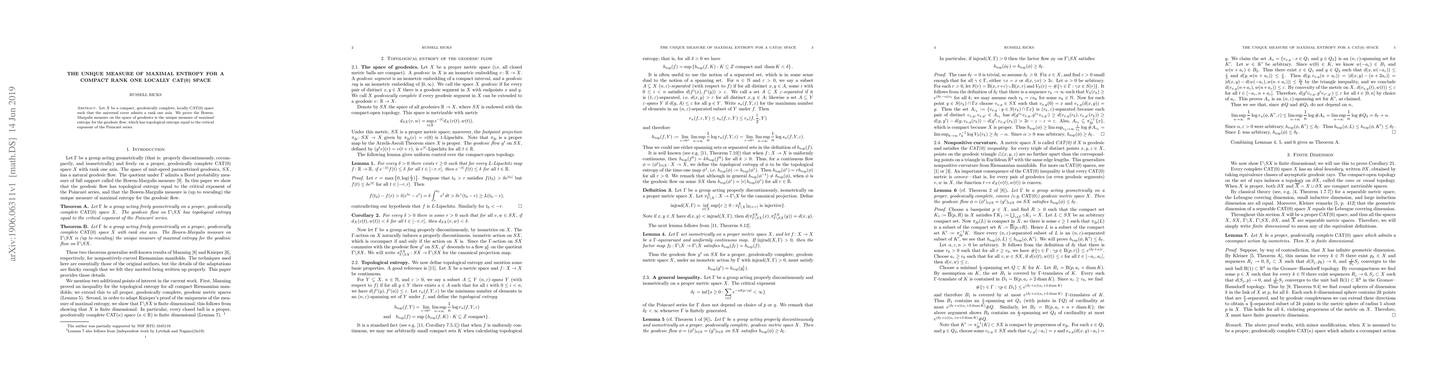 This paper proves that the Bowen-Margulis measure on the geodesic space of a compact, geodesically complete, locally CAT(0) space with a rank one axis is the unique measure of maximal entropy for its geodesic flow, with the flow's topological entropy matching the critical exponent of the Poincaré series.
