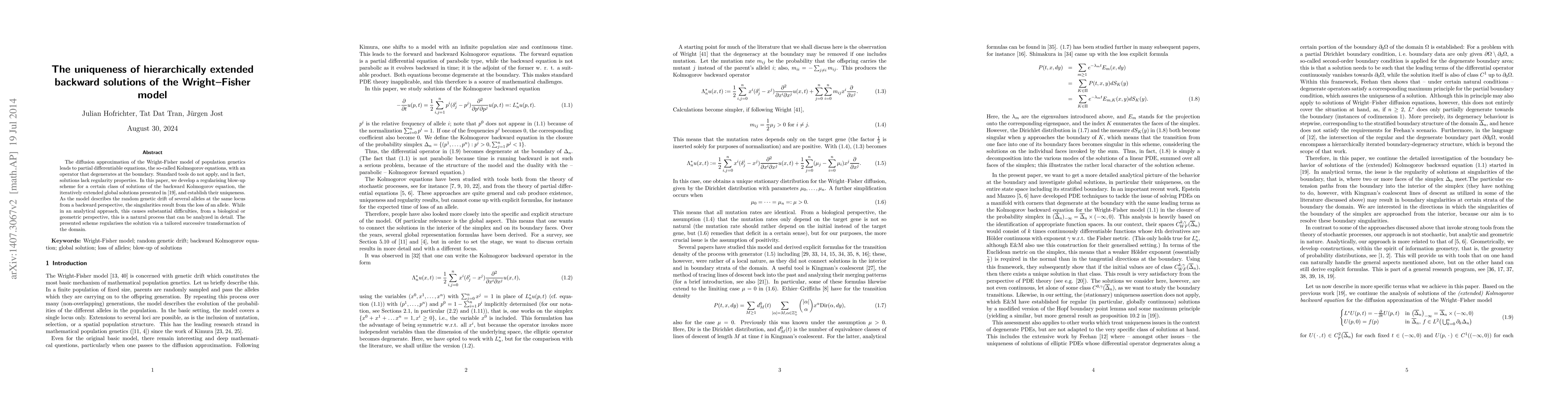 This paper develops a regularizing blow-up scheme for extended backward solutions of the Wright-Fisher model's Kolmogorov equations, establishing their uniqueness despite boundary singularities caused by allele loss. The scheme addresses analytical difficulties through a tailored successive transformation of the domain.