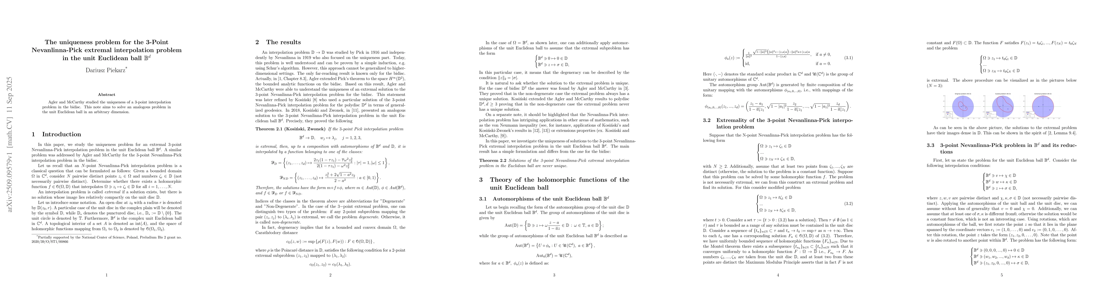 Agler and McCarthy studied the uniqueness of a 3-point interpolation problem in the bidisc. This note aims to solve an analogous problem in the unit Euclidean ball in an arbitrary dimension.