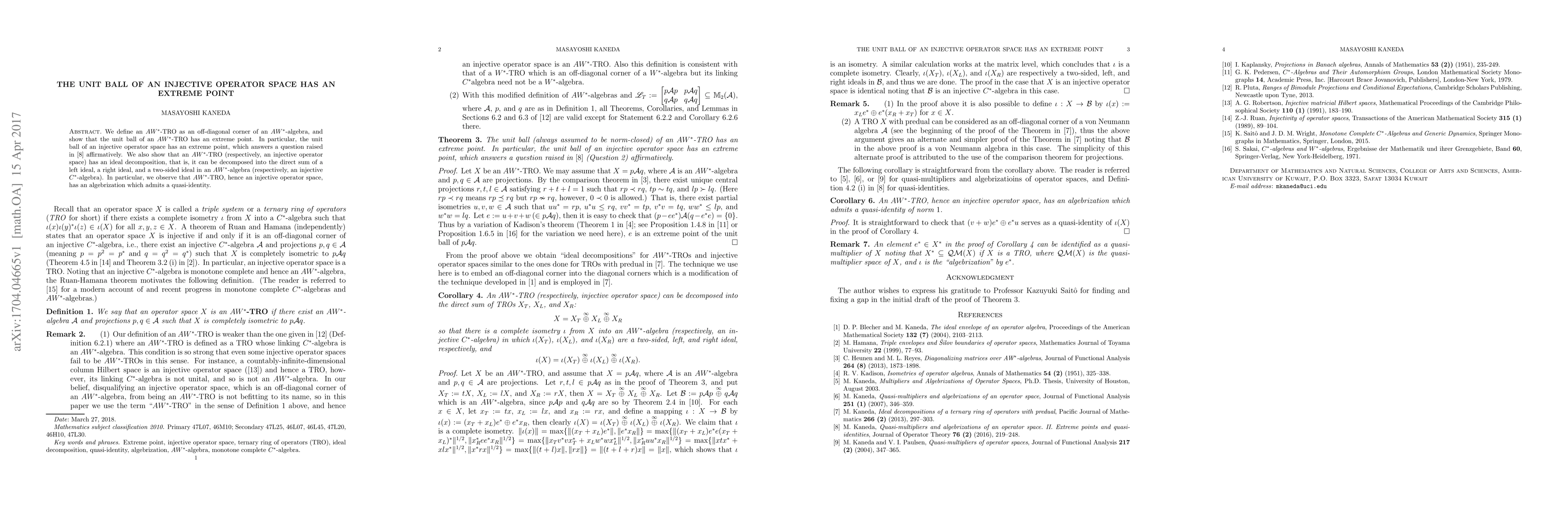 This paper demonstrates that the unit ball of an $AW^*$-TRO, and consequently an injective operator space, possesses an extreme point, addressing a prior question. Additionally, it reveals that $AW^*$-TROs and injective operator spaces can be decomposed into ideal components within their respective algebras.