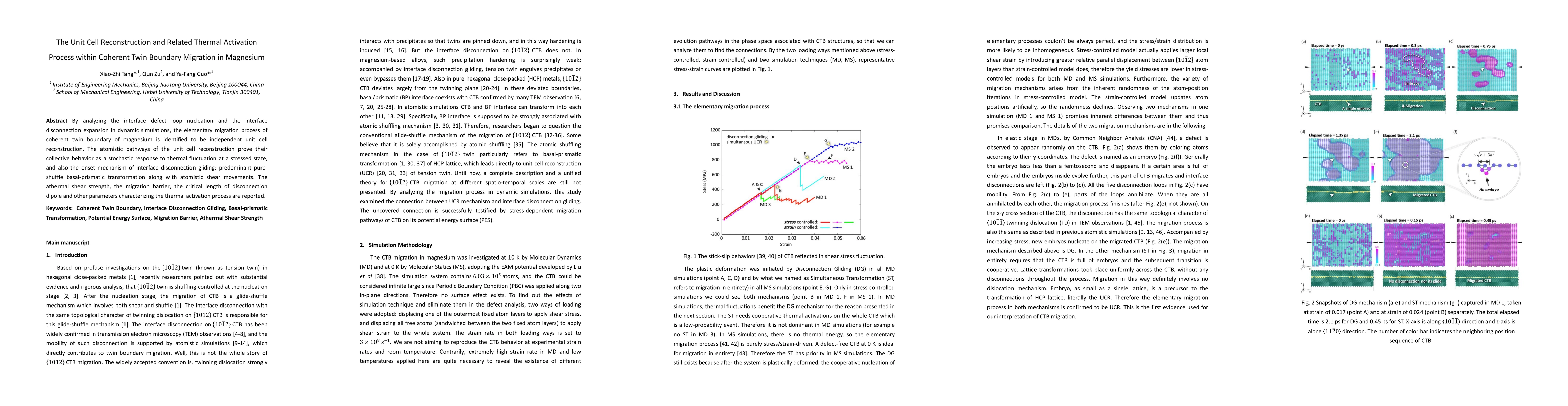 This research pinpoints the elementary migration process of coherent twin boundaries in magnesium as independent unit cell reconstruction, confirmed via dynamic simulations. It also reveals the stochastic response of these processes to thermal fluctuations under stress, and outlines the mechanism for interface disconnection gliding.