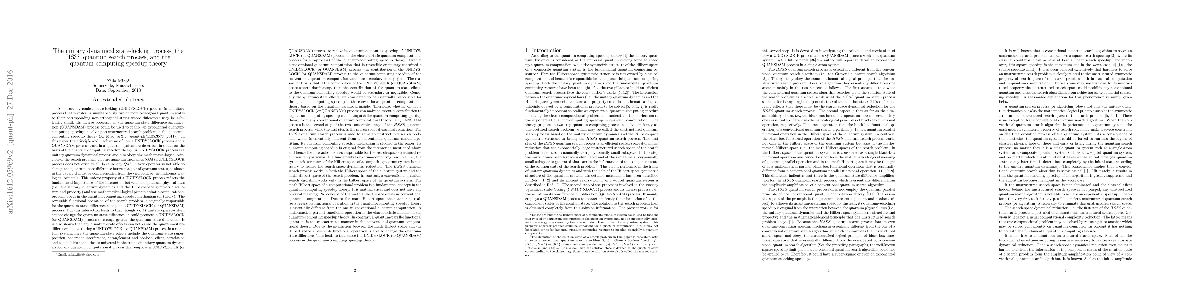 A unitary dynamical state-locking (UNIDYSLOCK) process is a unitary process that can transform two orthogonal states to two non-orthogonal states. Its inverse process, i.e., the QUANSDAM process could realize an exponential QC speedup in solving an unstructured search problem in the quantum-computing (QC) speedup theory (X. Miao, arXiv:1105.3573 [quant-ph] (2011)). In this paper the principle of how a UNIDYSLOCK process works is described on the basis of the QC speedup theory. A UNIDYSLOCK process does not exist at all in pure quantum mechanics. That it can change the quantum-state difference is original from the fundamental interaction between the quantum physical laws (i.e., the unitary quantum dynamics and the Hilbert-space symmetric structure) and the mathematical-logical principle of the search problem. It is characteristic for the QC speedup theory. Even if a usual quantum computational (Qc) process that is reversible or unitary contained a UNIDYSLOCK (or QUANSDAM) process, the contribution of the UNIDYSLOCK (or QUANSDAM) process to the QC speedup of the usual Qc process would be secondary or negligible. Whether or not a UNIDYSLOCK (or QUANSDAM) process can make an essential contribution to a QC speedup can distinguish the QC speedup theory from any usual Qc theory. In the paper the QC speedup mechanism of the HSSS quantum search process is also studied. The search process is essentially different from a usual quantum search algorithm. It works in both the usual Hilbert space and the math Hilbert space. Due to the math Hilbert space a mathematical-parallel operation is characteristic for the QC speedup theory, while a quantum-parallel operation is characteristic for the usual Qc theory. The fundamental interaction mentioned above and the fundamental quantum-computing resource play the main role in speeding up the search process.