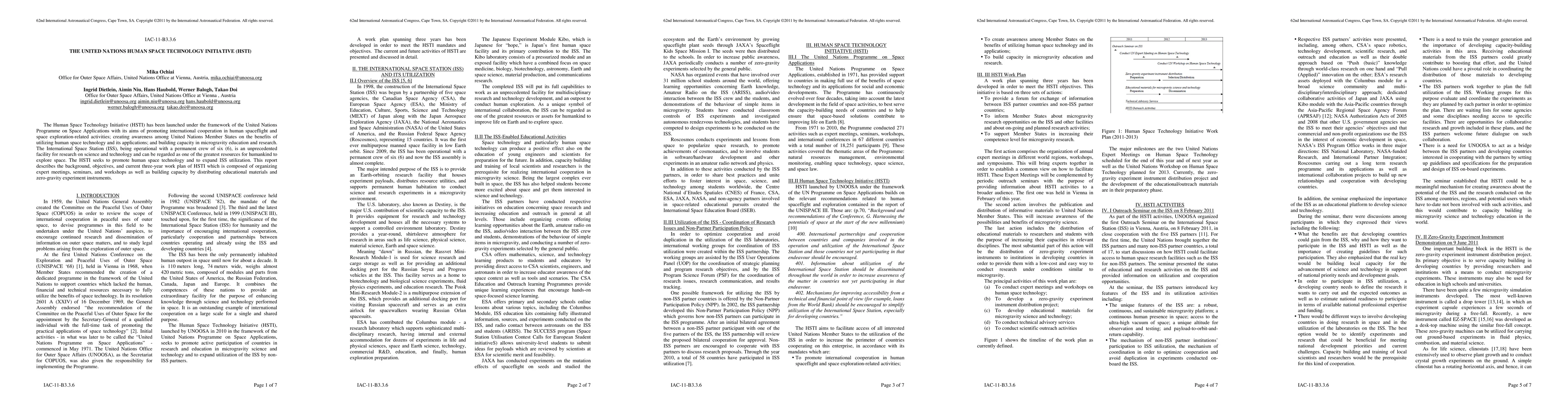 The Human Space Technology Initiative (HSTI) has been launched under the framework of the United Nations Programme on Space Applications with its aims of promoting international cooperation in human spaceflight and space exploration-related activities; creating awareness among United Nations Member States on the benefits of utilizing human space technology and its applications; and building capacity in microgravity education and research. The International Space Station (ISS), being operational with a permanent crew of six (6), is an unprecedented facility for research on science and technology and can be regarded as one of the greatest resources for humankind to explore space. The HSTI seeks to promote human space technology and to expand ISS utilization. This report describes the background, objectives, and current three-year work plan of HSTI which is composed of organizing expert meetings, seminars, and workshops as well as building capacity by distributing educational materials and zero-gravity experiment instruments.