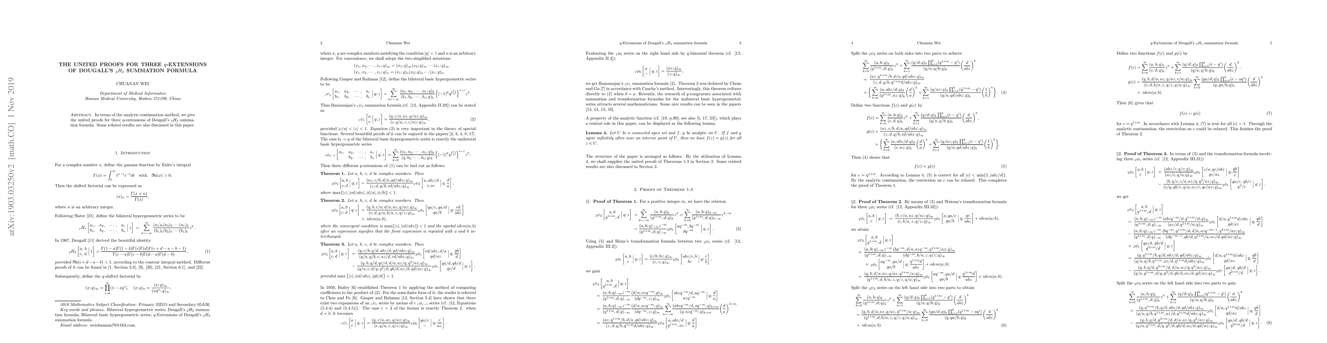 In terms of the analytic continuation method, we give the united proofs for three $q$-extensions of Dougall's $_2H_2$ summation formula. Some related results are also discussed in this paper.