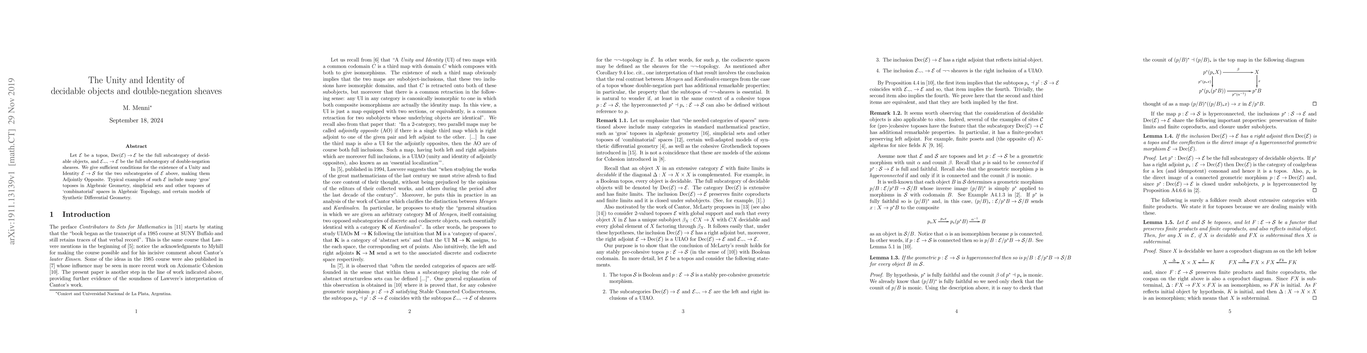 This paper explores sufficient conditions for constructing Unity and Identity between decidable objects and double-negation sheaves within a topos ${\cal E}$, making these subcategories adjoint opposites. Examples of applicable ${\cal E}$ include algebraic geometry toposes, simplicial sets, and models of synthetic differential geometry.