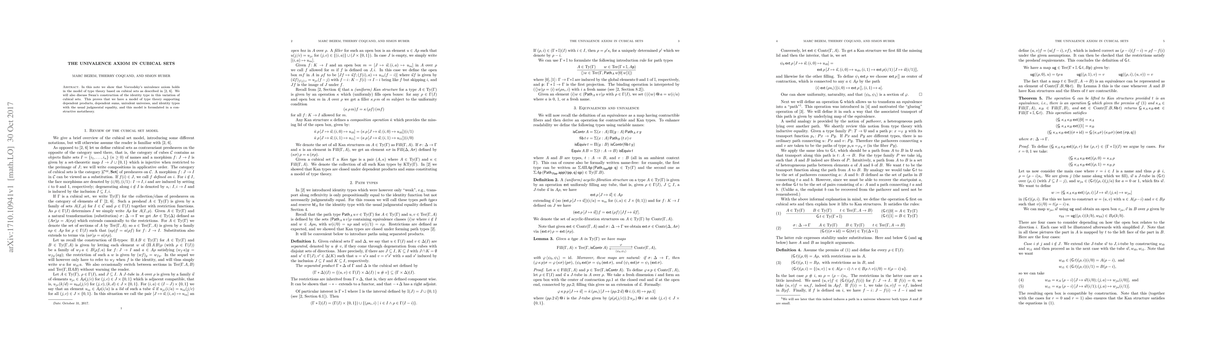 Summary: This paper demonstrates the validity of Voevodsky's univalence axiom within a type theory model based on symmetric cubical sets, proving a constructive metatheory that supports dependent products, sums, univalent universes, and identity types.
