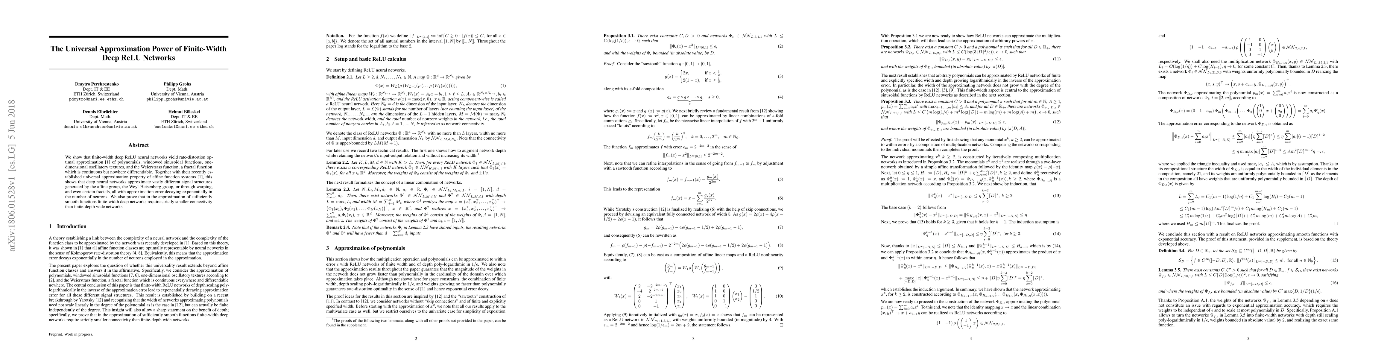 We show that finite-width deep ReLU neural networks yield rate-distortion optimal approximation (B\"olcskei et al., 2018) of polynomials, windowed sinusoidal functions, one-dimensional oscillatory textures, and the Weierstrass function, a fractal function which is continuous but nowhere differentiable. Together with their recently established universal approximation property of affine function systems (B\"olcskei et al., 2018), this shows that deep neural networks approximate vastly different signal structures generated by the affine group, the Weyl-Heisenberg group, or through warping, and even certain fractals, all with approximation error decaying exponentially in the number of neurons. We also prove that in the approximation of sufficiently smooth functions finite-width deep networks require strictly smaller connectivity than finite-depth wide networks.