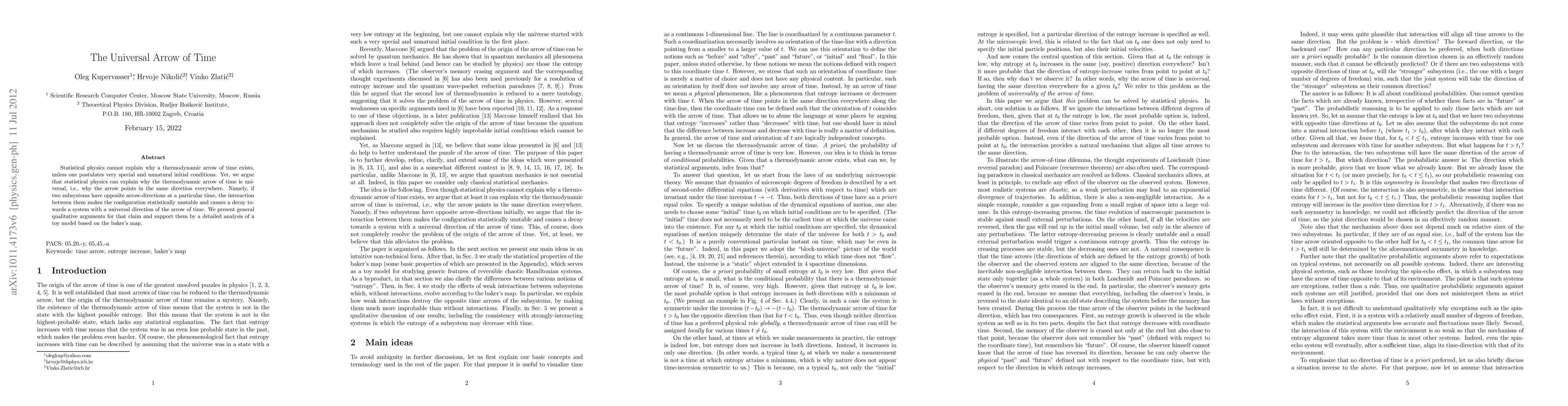 This paper argues that statistical physics can explain the universality of the thermodynamic arrow of time by demonstrating that interactions between subsystems with opposite temporal directions lead to statistical instability, driving them towards a configuration with a consistent, universal arrow of time. This is supported by a detailed analysis using a baker's map model.