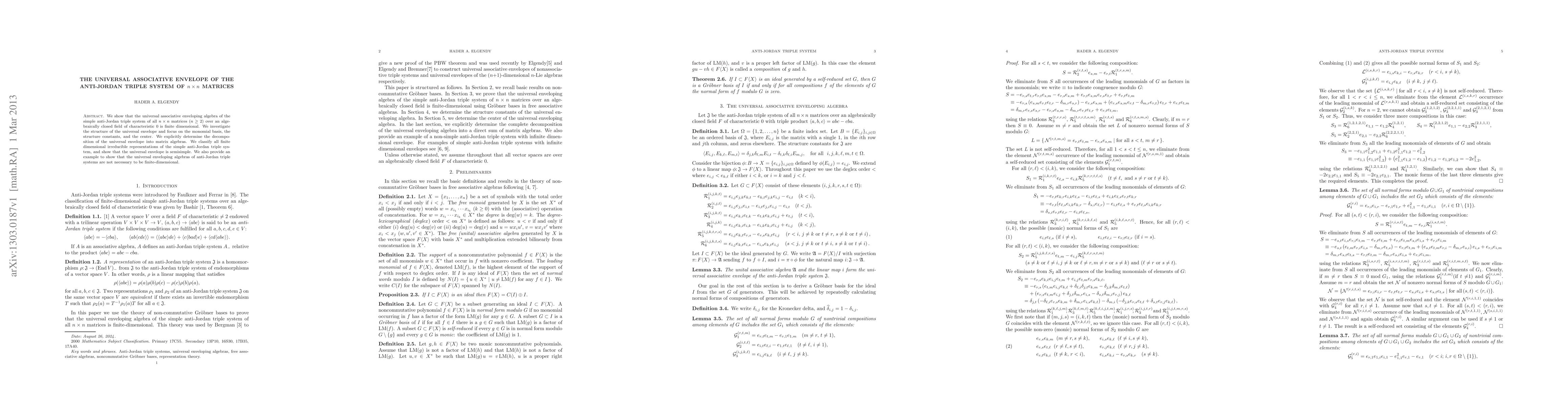 This paper investigates the universal associative enveloping algebra of the simple anti-Jordan triple system of $n \times n$ matrices over an algebraically closed field. The authors demonstrate that this algebra is finite-dimensional, classify its irreducible representations, and show it to be semisimple.