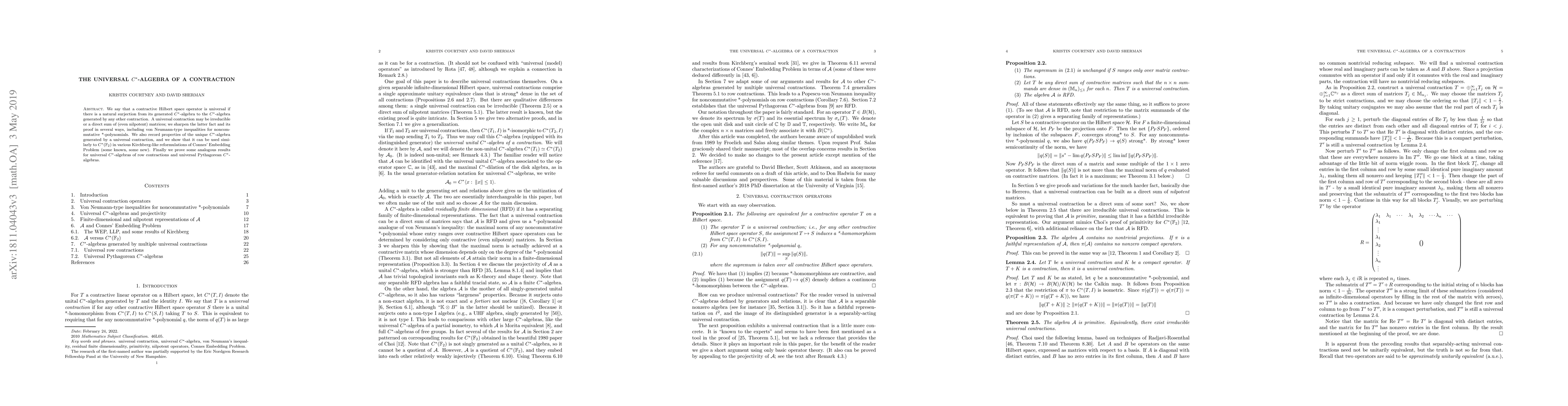 This paper explores the concept of universal C*-algebras generated by contraction operators, proving that certain universal contractions can be decomposed into irreducible or nilpotent matrices. It also discusses the properties of these algebras and their applications in reformulating Connes' Embedding Problem, alongside analogous results for noncommuting row contractions and Pythagorean C*-algebras.
