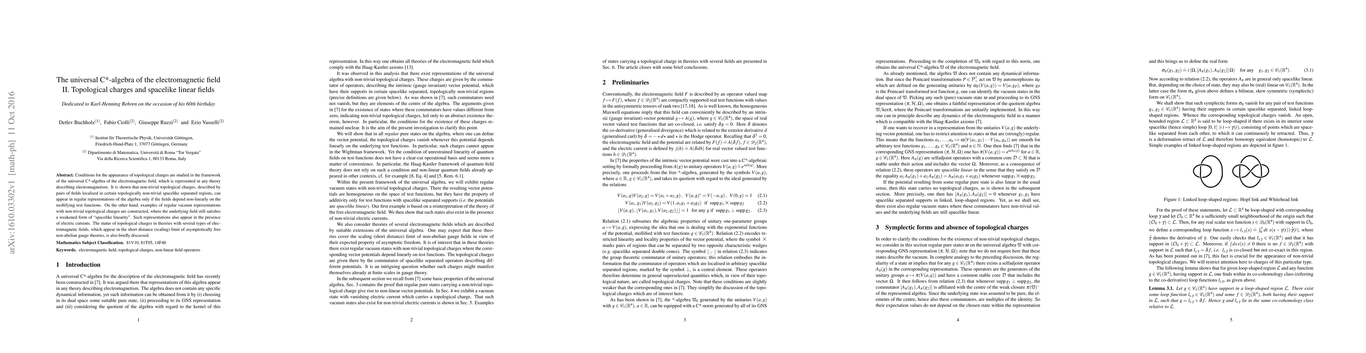 Conditions for the appearance of topological charges are studied in the framework of the universal C*-algebra of the electromagnetic field, which is represented in any theory describing electromagnetism. It is shown that non-trivial topological charges, described by pairs of fields localised in certain topologically non-trivial spacelike separated regions, can appear in regular representations of the algebra only if the fields depend non-linearly on the mollifying test functions. On the other hand, examples of regular vacuum representations with non-trivial topological charges are constructed, where the underlying field still satisfies a weakened form of "spacelike linearity". Such representations also appear in the presence of electric currents. The status of topological charges in theories with several types of electromagnetic fields, which appear in the short distance (scaling) limit of asymptotically free non-abelian gauge theories, is also briefly discussed.