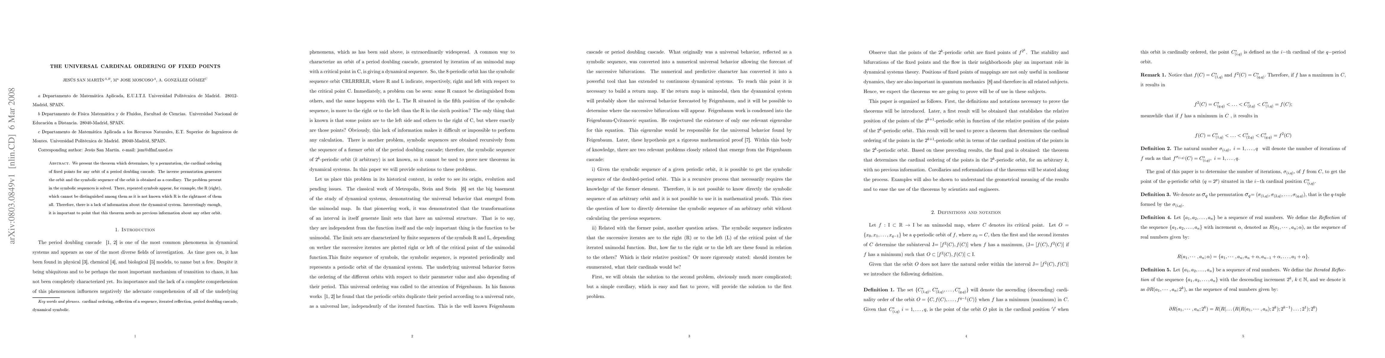We present the theorem which determines, by a permutation, the cardinal ordering of fixed points for any orbit of a period doubling cascade. The inverse permutation generates the orbit and the symbolic sequence of the orbit is obtained as a corollary. The problem present in the symbolic sequences is solved. There, repeated symbols appear, for example, the R (right), which cannot be distinguished among them as it is not known which R is the rightmost of them all. Therefore, there is a lack of information about the dynamical system. Interestingly enough, it is important to point that this theorem needs no previous information about any other orbit.