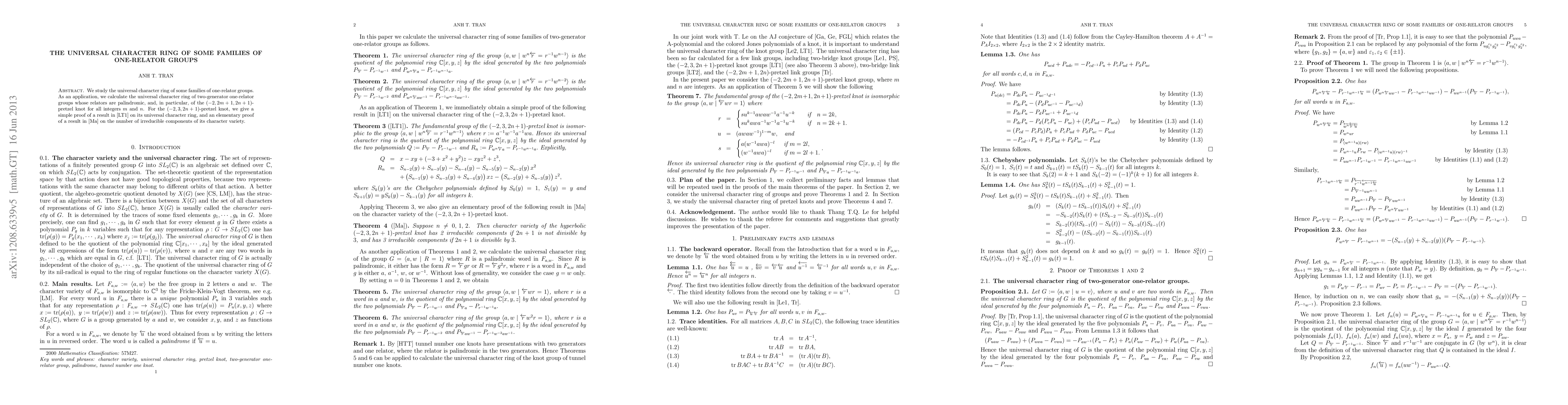 This paper investigates the universal character ring of specific one-relator groups, focusing on two-generator examples with palindromic relators, including those corresponding to (-2,2m+1,2n+1)-pretzel knots. It provides a less technical proof for the universal character ring of the (-2,3,2n+1)-pretzel knot and an elementary proof for the number of irreducible components in its character variety.