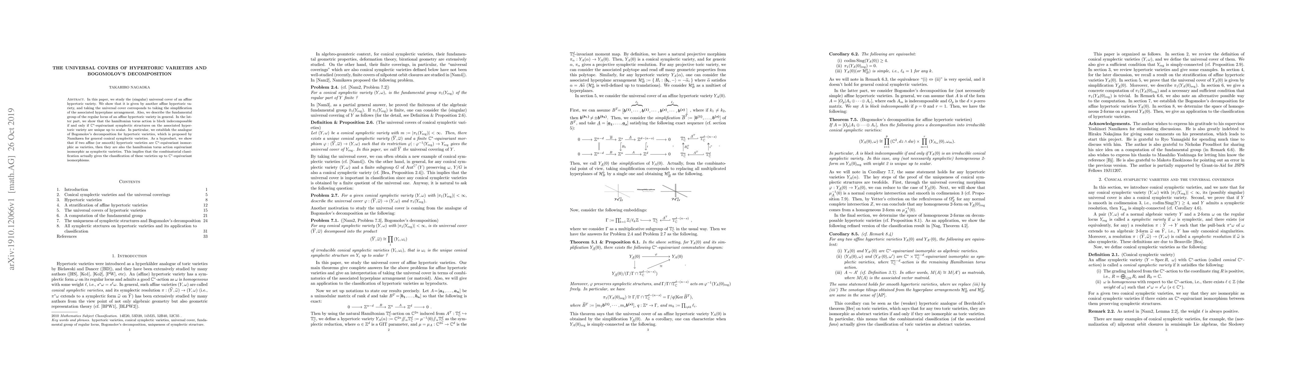 In this paper, we study the (singular) universal cover of an affine hypertoric variety. We show that it is given by another affine hypertoric variety, and taking the universal cover corresponds to taking the simplification of the associated hyperplane arrangement. Also, we describe the fundamental group of the regular locus of an affine hypertoric variety in general. In the latter part, we show that the hamiltonian torus action is block indecomposable if and only if $\mathbb{C}^*$-equivariant symplectic structures on the associated hypertoric variety are unique up to scalar. In particular, we establish the analogue of Bogomolov's decomposition for hypertoric varieties, which is proposed by Namikawa for general conical symplectic varieties. As a byproduct, we show that if two affine (or smooth) hypertoric varieties are $\mathbb{C}^*$-equivariant isomorphic as varieties, then they are also the hamiltonian torus action equivariant isomorphic as symplectic varieties. This implies that the combinatorial classification actually gives the classification of these varieties up to $\mathbb{C}^*$-equivariant isomorphisms.