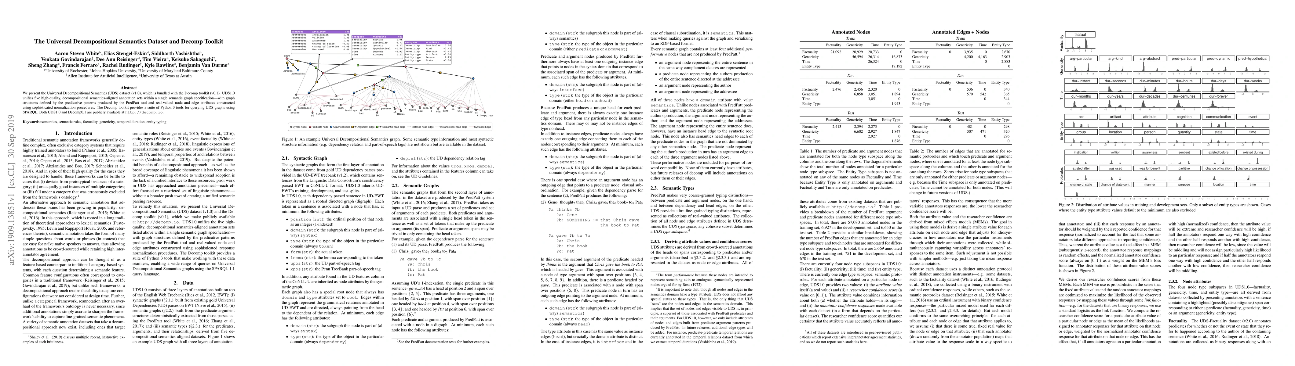 The Universal Decompositional Semantics (UDS) dataset v1.0 integrates five annotation sets into a unified semantic graph, while the Decomp toolkit v0.1 offers Python tools for querying these graphs via SPARQL. Both resources are freely accessible online.