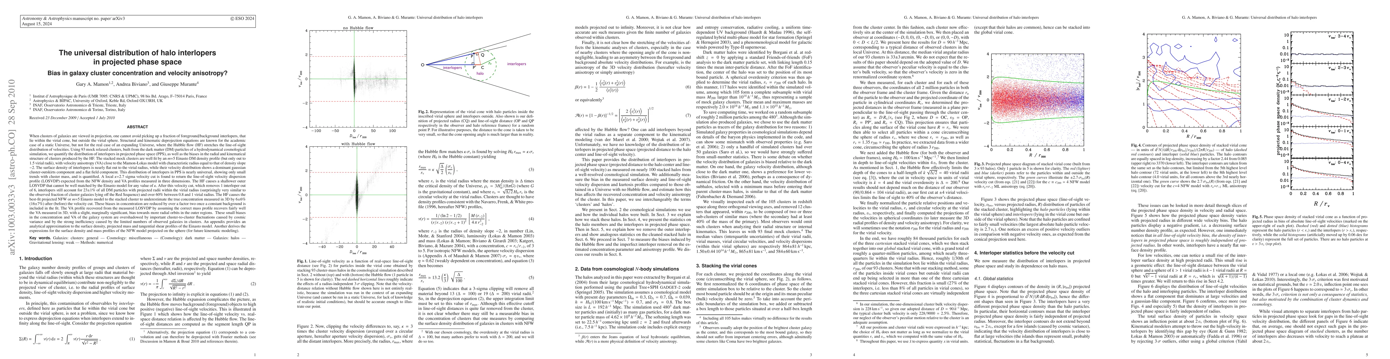 When clusters of galaxies are viewed in projection, one cannot avoid picking up foreground/background interlopers (FBIs), that lie within the virial cone (VC), but outside the virial sphere. Structural & kinematic deprojection equations are not known for an expanding Universe, where the Hubble flow (HF) stretches the line-of-sight (LOS) distribution of velocities. We analyze 93 mock relaxed clusters, built from a cosmological simulation. The stacked mock cluster is well fit by an m=5 Einasto DM density profile (but only out to 1.5 virial radii [r_v]), with velocity anisotropy (VA) close to the Mamon-Lokas model with VA radius equal to that of density slope -2. The surface density of FBIs is nearly flat out to r_v, while their LOS velocity distribution shows a dominant gaussian cluster-outskirts component and a flat field component. This distribution of FBIs in projected phase space is nearly universal in mass. A local k=2.7 sigma velocity cut returns the LOS velocity dispersion profile (LOSVDP) expected from the NFW density and VA profiles measured in 3D. The HF causes a shallower outer LOSVDP that cannot be well matched by the Einasto model for any k. After this velocity cut, FBIs still account for 23% of DM particles within the VC (close to the observed fraction of cluster galaxies lying off the Red Sequence). The best-fit projected NFW/Einasto models underestimate the 3D concentration by 6+/-6% (16+/-7%) after (before) the velocity cut, unless a constant background is included in the fit. Assuming the correct mass profile, the VA profile is well recovered from the measured LOSVDP, with a slight bias towards more radial orbits in the outer regions. These small biases are overshadowed by large cluster-cluster variations caused by cosmic variance. An appendix provides an analytical approximation to the surface density, projected mass and tangential shear profiles of the Einasto model.