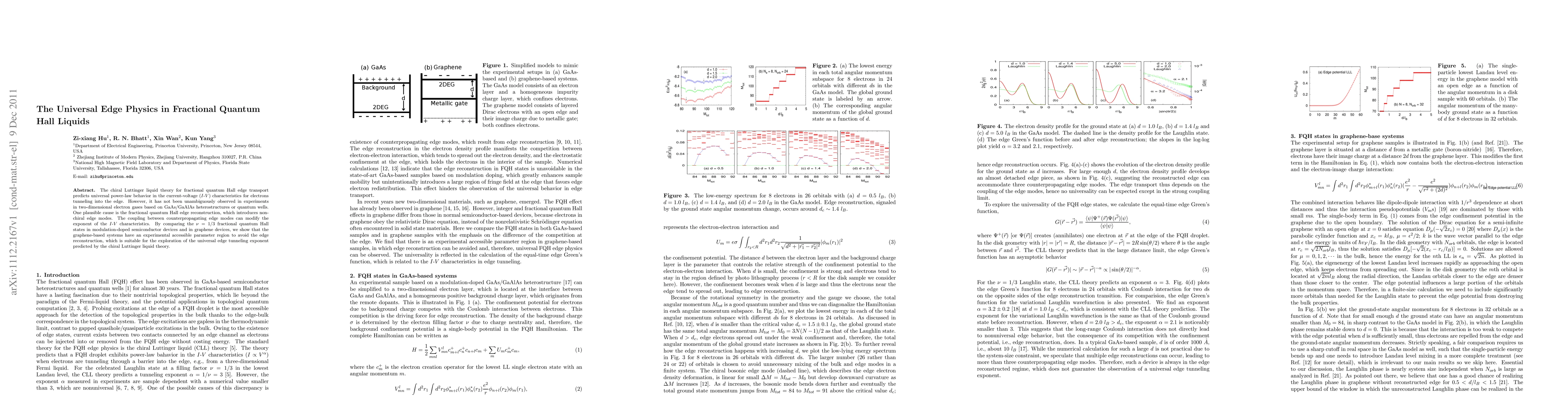 The paper discusses the universal edge physics in fractional quantum Hall liquids, focusing on the current-voltage characteristics. It highlights that graphene devices provide an accessible parameter region to avoid edge reconstruction, thereby allowing the exploration of the universal edge tunneling exponent predicted by the chiral Luttinger liquid theory.