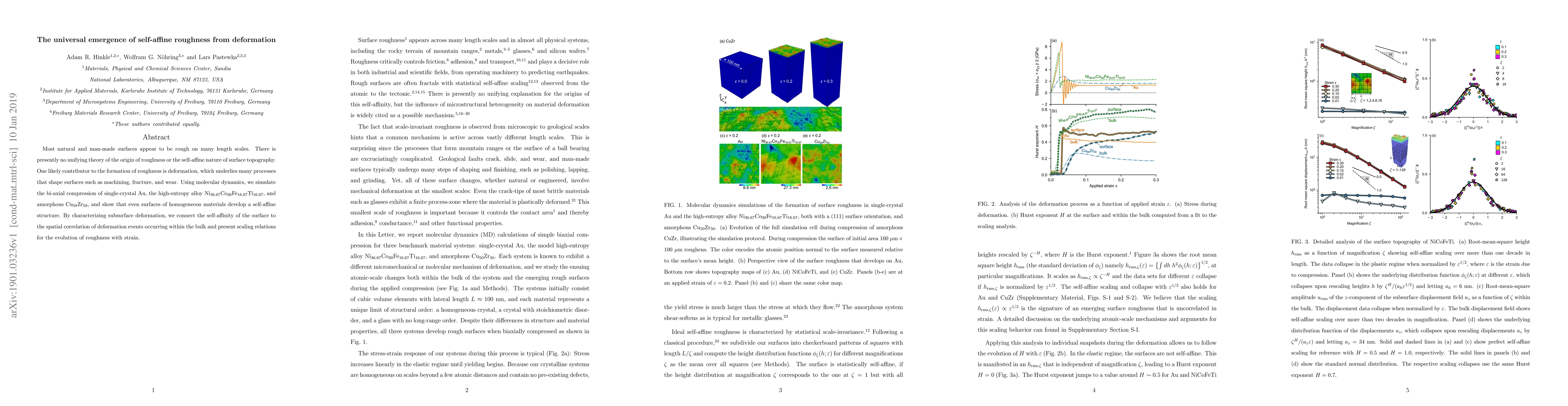 This paper demonstrates through molecular dynamics simulations that deformation, such as bi-axial compression, leads to the universal emergence of self-affine roughness in surfaces of various materials, including single-crystal Au, high-entropy alloys, and amorphous alloys. The study connects surface roughness to the spatial correlation of deformation events within the bulk material.