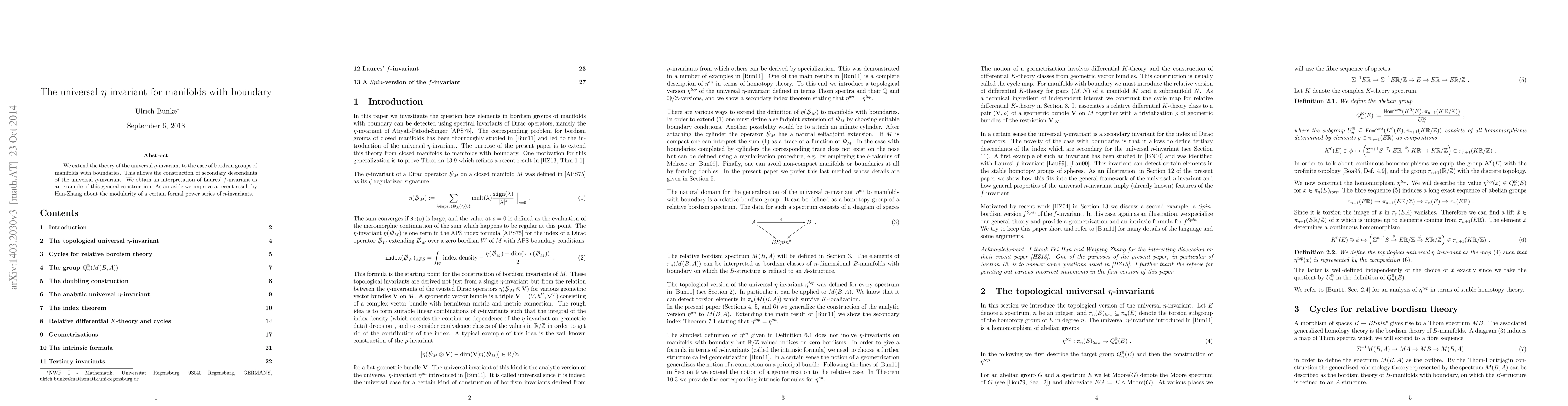 We extend the theory of the universal eta-invariant to the case of relative bordism groups of manifolds with boundaries. This allows the construction of secondary descendants of the universal eta-invariant. We obtain an interpretation of Laures' f-invariant as an example of this general construction. As an aside we improve a recent result of Han-Zhang on the modularity of a certain power series of eta invariants.