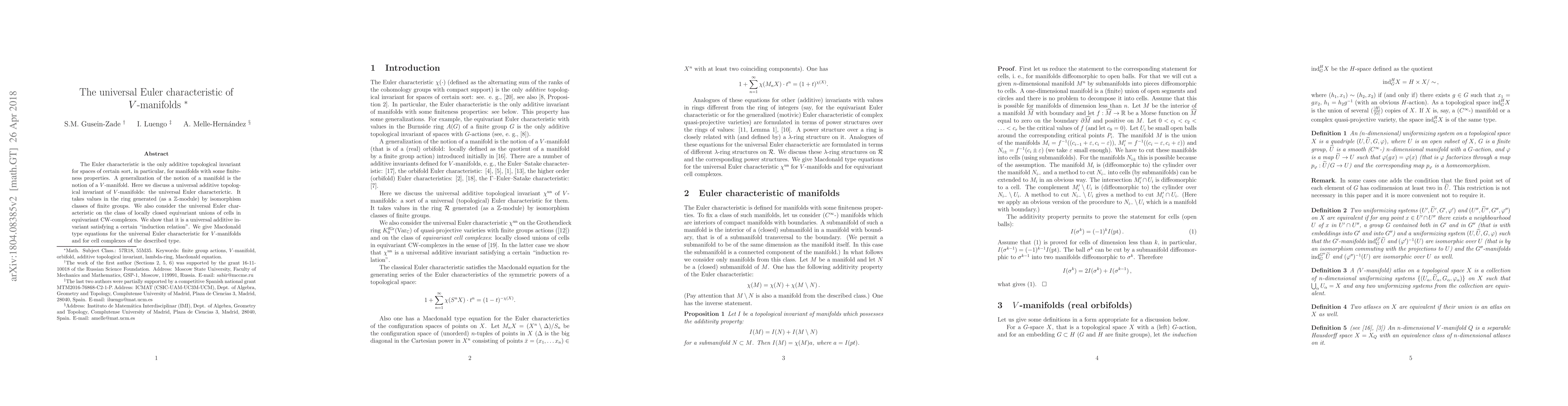 This paper introduces the universal Euler characteristic as a universal additive topological invariant for V-manifolds, generalizing the classical Euler characteristic. It also extends this concept to locally closed equivariant unions of cells in equivariant CW-complexes, providing Macdonald type equations for these settings.