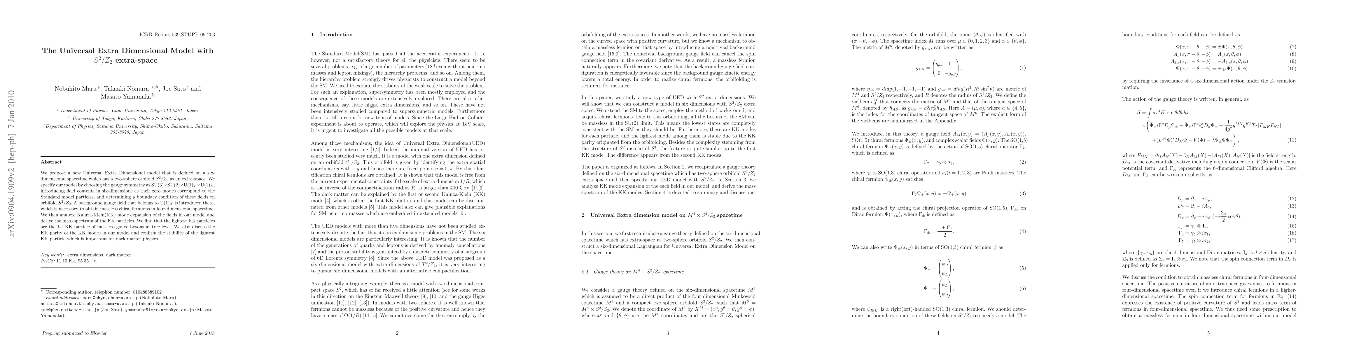 This paper proposes a new Universal Extra Dimensional model based on a six-dimensional spacetime with a $S^2/Z_2$ orbifold extra-space. The model incorporates gauge symmetry SU(3)×SU(2)×U(1)_Y×U(1)_X and derives the mass spectrum of Kaluza-Klein particles, with the lightest being the 1st KK particle of massless gauge bosons, which is stable and could serve as dark matter.