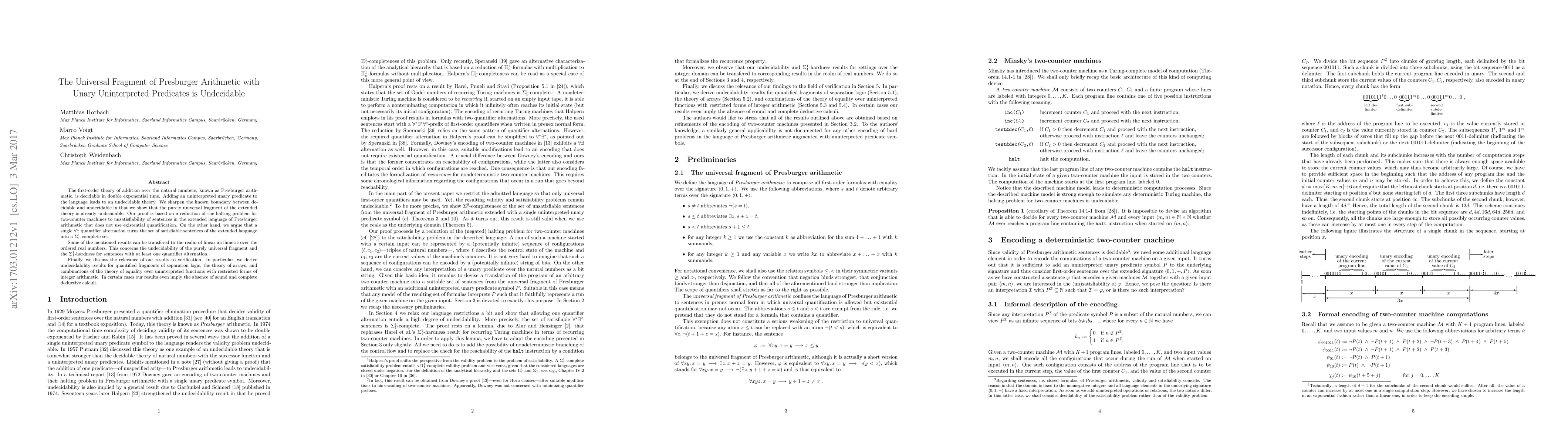The first-order theory of addition over the natural numbers, known as Presburger arithmetic, is decidable in double exponential time. Adding an uninterpreted unary predicate to the language leads to an undecidable theory. We sharpen the known boundary between decidable and undecidable in that we show that the purely universal fragment of the extended theory is already undecidable. Our proof is based on a reduction of the halting problem for two-counter machines to unsatisfiability of sentences in the extended language of Presburger arithmetic that does not use existential quantification. On the other hand, we argue that a single $\forall\exists$ quantifier alternation turns the set of satisfiable sentences of the extended language into a $\Sigma^1_1$-complete set. Some of the mentioned results can be transfered to the realm of linear arithmetic over the ordered real numbers. This concerns the undecidability of the purely universal fragment and the $\Sigma^1_1$-hardness for sentences with at least one quantifier alternation. Finally, we discuss the relevance of our results to verification. In particular, we derive undecidability results for quantified fragments of separation logic, the theory of arrays, and combinations of the theory of equality over uninterpreted functions with restricted forms of integer arithmetic. In certain cases our results even imply the absence of sound and complete deductive calculi.