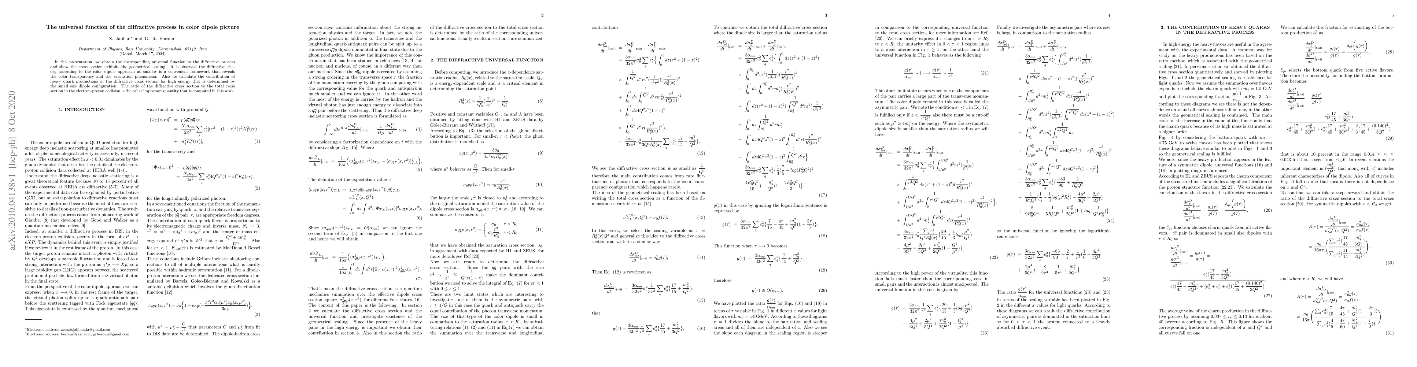 In this presentation, we obtain the corresponding universal function to the diffractive process and show the cross section exhibits the geometrical scaling. It is observed the diffractive theory according to the color dipole approach at small-$x$ is a convenient framework that reveals the color transparency and the saturation phenomena. Also we calculate the contribution of heavy quark productions in the diffractive cross section for high energy that is determined by the small size dipole configuration. The ratio of the diffractive cross section to the total cross section in the electron-proton collision is the other important quantity that is computed in this work.