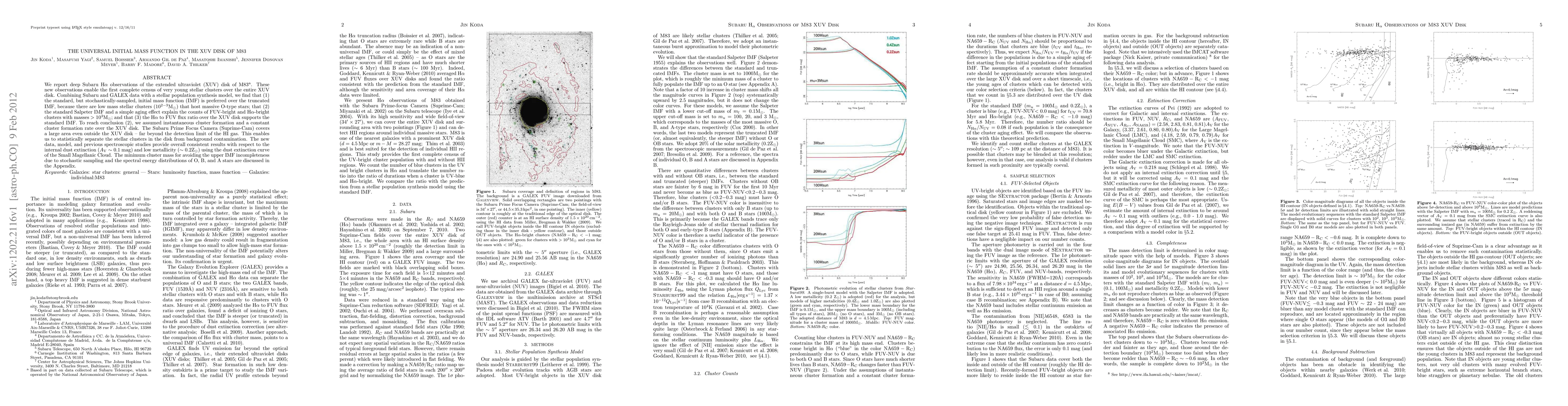 We report deep Subaru Halpha observations of the XUV disk of M83. These new observations enable the first complete census of very young stellar clusters over the entire XUV disk. Combining Subaru and GALEX data with a stellar population synthesis model, we find that (1) the standard, but stochastically-sampled, initial mass function (IMF) is preferred over the truncated IMF, because there are low mass stellar clusters (10^{2-3}Msun) that host massive O-type stars; that (2) the standard Salpeter IMF and a simple aging effect explain the counts of FUV-bright and Halpha-bright clusters with masses >10^3Msun; and that (3) the Halpha to FUV flux ratio over the XUV disk supports the standard IMF. The Subaru Prime Focus Camera (Suprime-Cam) covers a large area even outside the XUV disk -- far beyond the detection limit of the HI gas. This enables us to statistically separate the stellar clusters in the disk from background contamination. The new data, model, and previous spectroscopic studies provide overall consistent results with respect to the internal dust extinction (Av~0.1 mag) and low metallicity (~0.2Zsun) using the dust extinction curve of SMC.