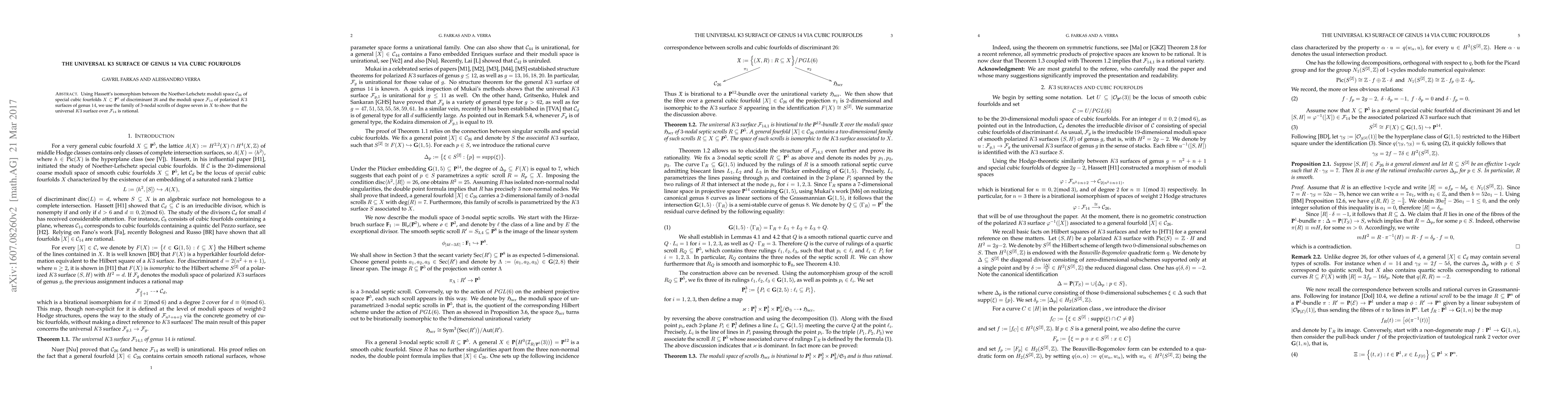 Using the isomorphism between the moduli space of polarized K3 surfaces of genus 14 and the moduli space of special cubic fourfolds of discriminant 26, we establish the rationality of the universal K3 surface of genus 14. Precisely, we show that the universal K3 surface of genus 14 is a projective bundle over a certain moduli space of nodal scrolls in P^5, whose rationality we prove using a degenerate version of Mukai's structure theorem for curves of genus 8.
