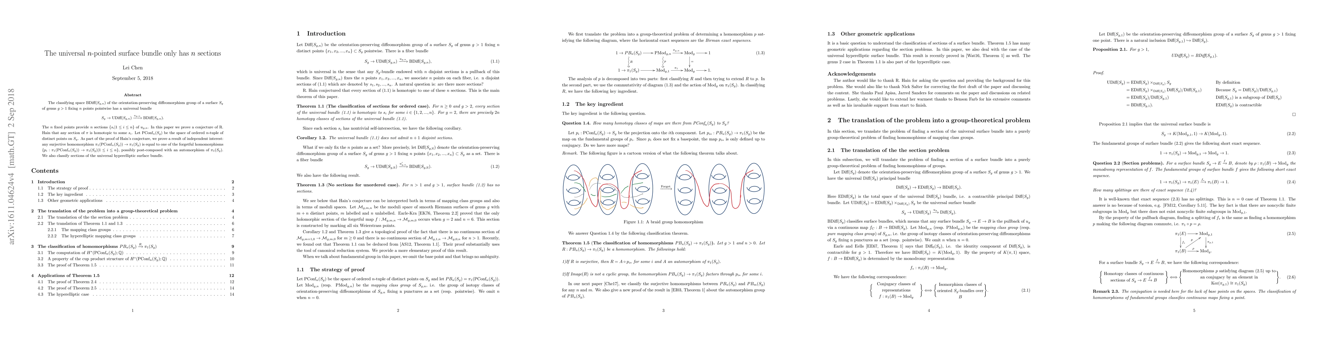 The classifying space BDiff$(S_{g,n})$ of the orientation-preserving diffeomorphism group of the surface $S_{g,n}$ of genus $g>1$ with $n$ ordered marked points has a universal bundle \[ S_g \to \text{UDiff}(S_{g,n})\xrightarrow{\pi}\text{BDiff}(S_{g,n}). \] The fixed $n$ points provide $n$ sections $s_i$ of $\pi$. In this paper we prove a conjecture of R. Hain that any section of $\pi$ is homotopic to some $s_i$. Let $\text{PConf}_n(S_g)$ be the ordered $n$-tuples of distinct points on $S_g$. As part of the proof, we prove a result of independent interest: any surjective homomorphism $\pi_1(\text{PConf}_n(S_g))\to \pi_1(S_g)$ is equal to one of the forgetful maps $\{p_i:\pi_1(\text{PConf}_n(S_g))\to \pi_1(S_g)\}$, possibly post-composed with an automorphism of $\pi_1(S_g)$. Using similar arguments, we then show that the universal surface bundle that fixes $n$ points as a set does not have any section.