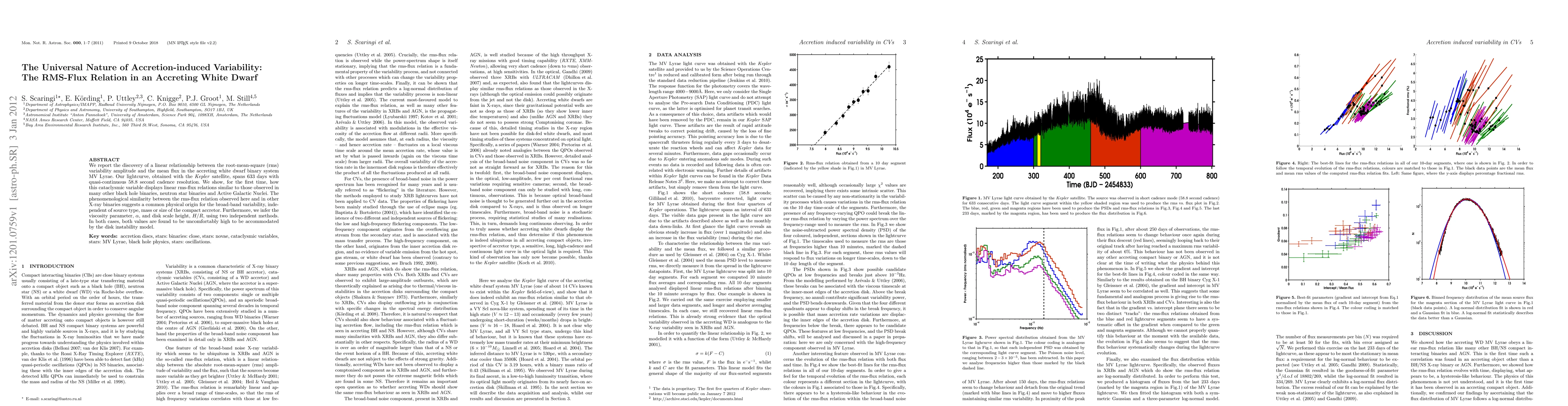 This paper discovers a linear relationship between root-mean-square variability and mean flux in the accreting white dwarf MV Lyrae, mirroring variability seen in other X-ray binaries, suggesting a universal mechanism for accretion-induced variability. The study also finds high viscosity and disk scale height values that challenge the disk instability model.